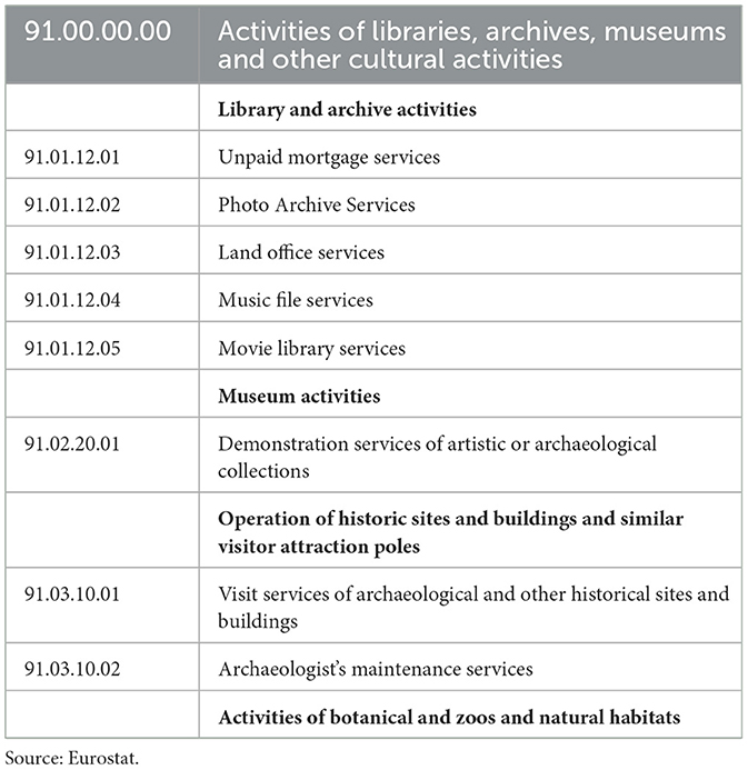 Table 1 below presents in detail the activities of the cultural heritage sector following Eurostat.