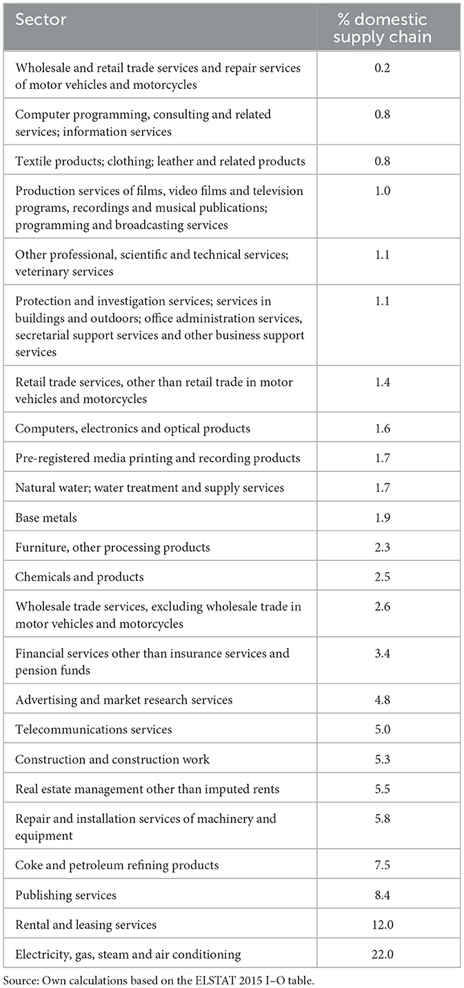 This study used the 2015 Input–Output (I–O) Table published by Greece's National Statistical Office (ELSTAT) in basic prices and product by product, in accordance with the revised ESA 95 national accounts system of 2015, according to which the Greek economy is divided into 65 sectors following the European standards. The symmetrical Input–Output Tables are matrices of the “product-product” that combine both supply and uses. These tables present the structure of production costs and the added value created during the production process; the flows of goods and services produced within the national economy and the flows of goods and services in relation to abroad.