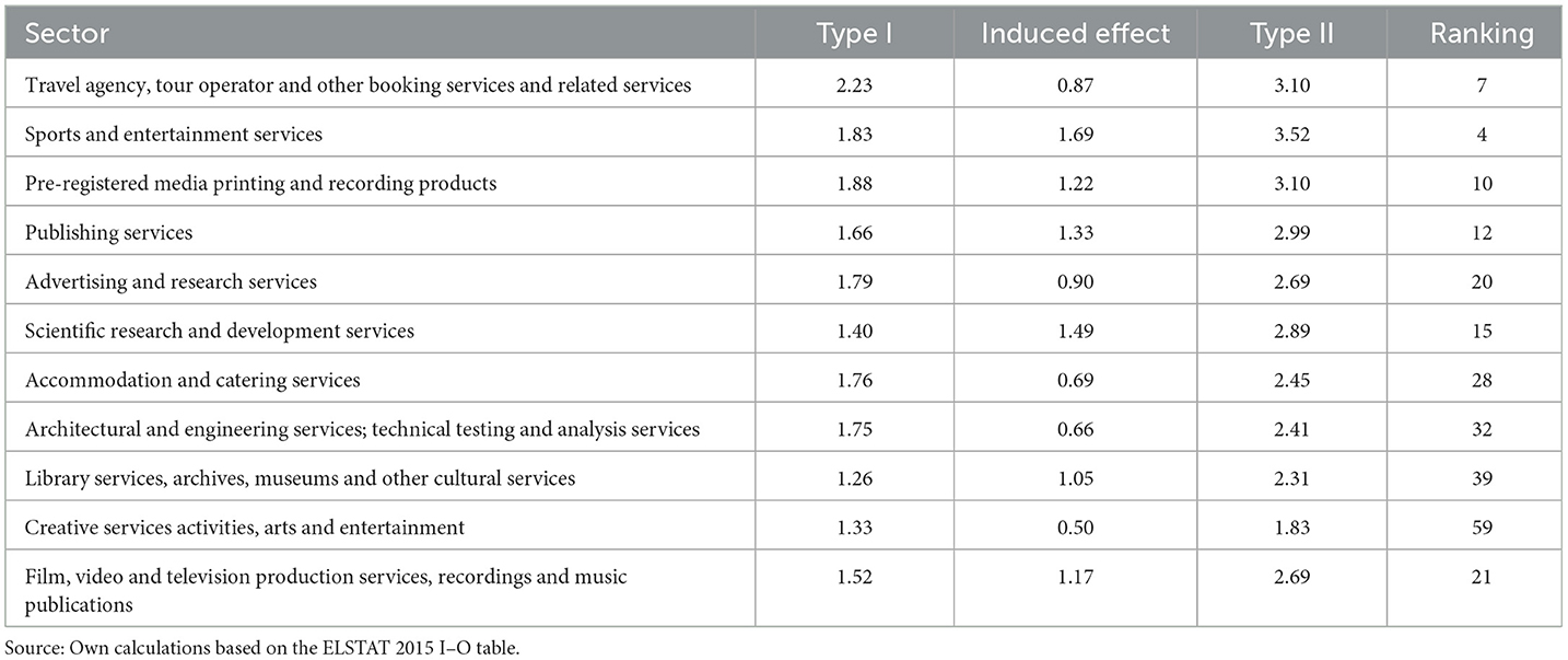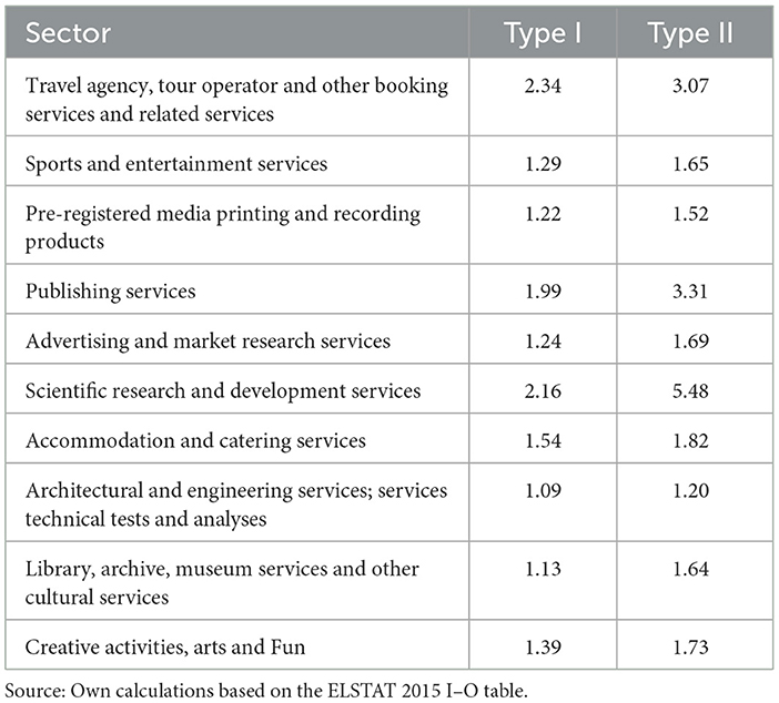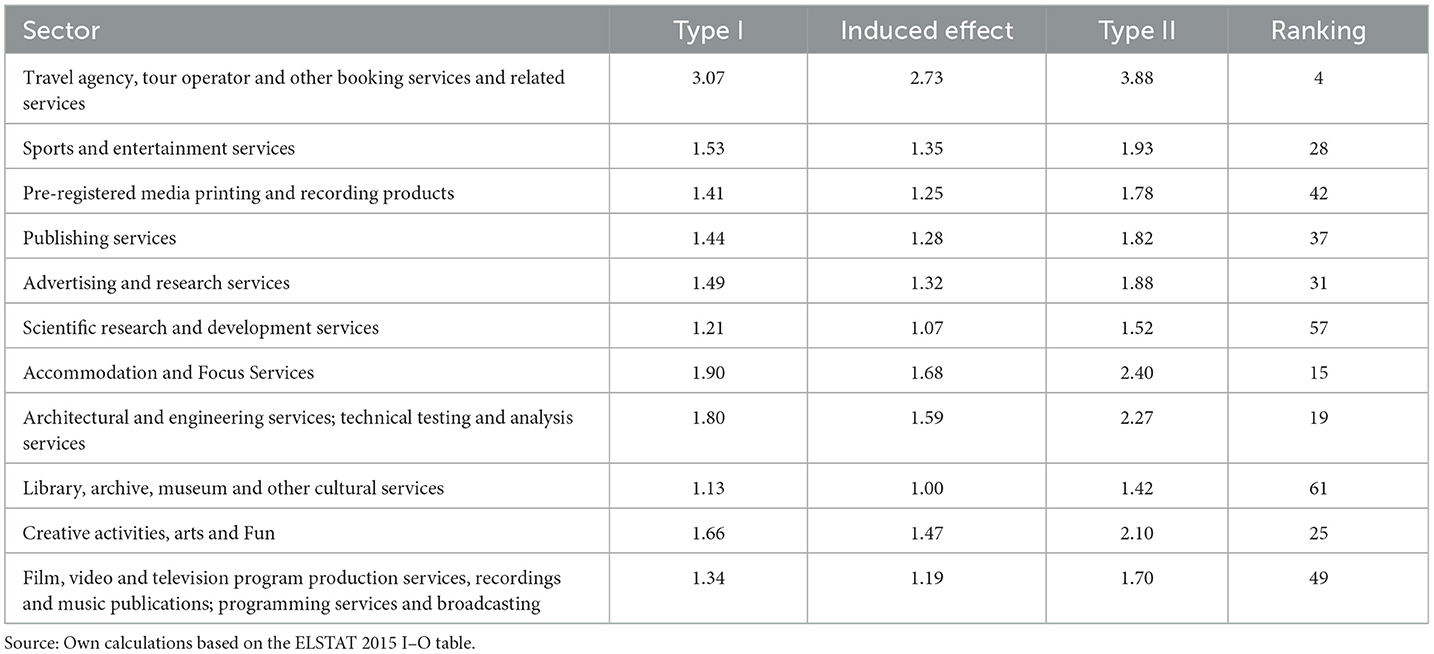 After special processing and analyzing the cultural heritage sector, the table was analyzed in 67 sectors. In the final stage, the Type I and II multipliers of Table 67*67 of the Greek economy were calculated, and the results were processed, and are presented below in the form of tables and diagrams to facilitate the analysis.