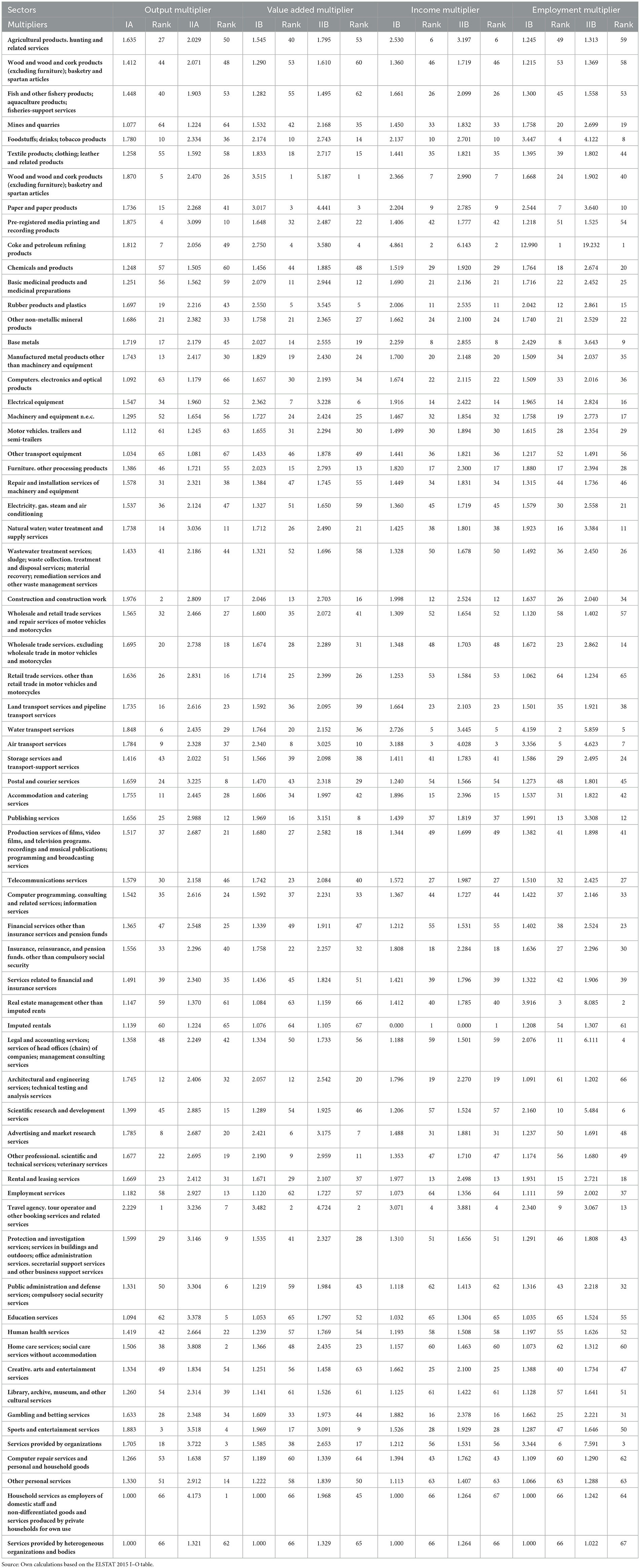 3. Employment multiplier ⟦(Emultj): which assesses the relationship between the change in the final demand of a particular sector and the employment required to meet it. It is expressed in physical units (number of employees or equivalent unit of employment per million €, and not in values, i.e., labor costs per unit of product) and shows the immediate change in the number of employees in an industry from the one-unit change in the outflow of that sector, where “w” equals the full-time equivalent employment per € of total production in the industry. Derived from Emultj=ΣiwiLij/wj.