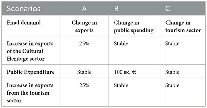 In this study t indicates the period of Input–Output tables, i.e., 2015, while t + 1 indicates a future period if we implement the proposed policies of the scenario. Based on the results of the three scenarios assessed below, relative policy proposals on cultural heritage in Greece can be documented.