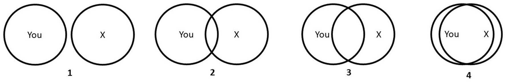 In Step 1, three real social relationships, each representing three different degrees of interpersonal closeness, were elicited for further procedural use in the experiment. The participants were shown the picture of a four-level-adapted version of the original seven-level IOS Scale (Aron et al., 1992), familiarizing them with the concept of interpersonal closeness (see Figure 1).