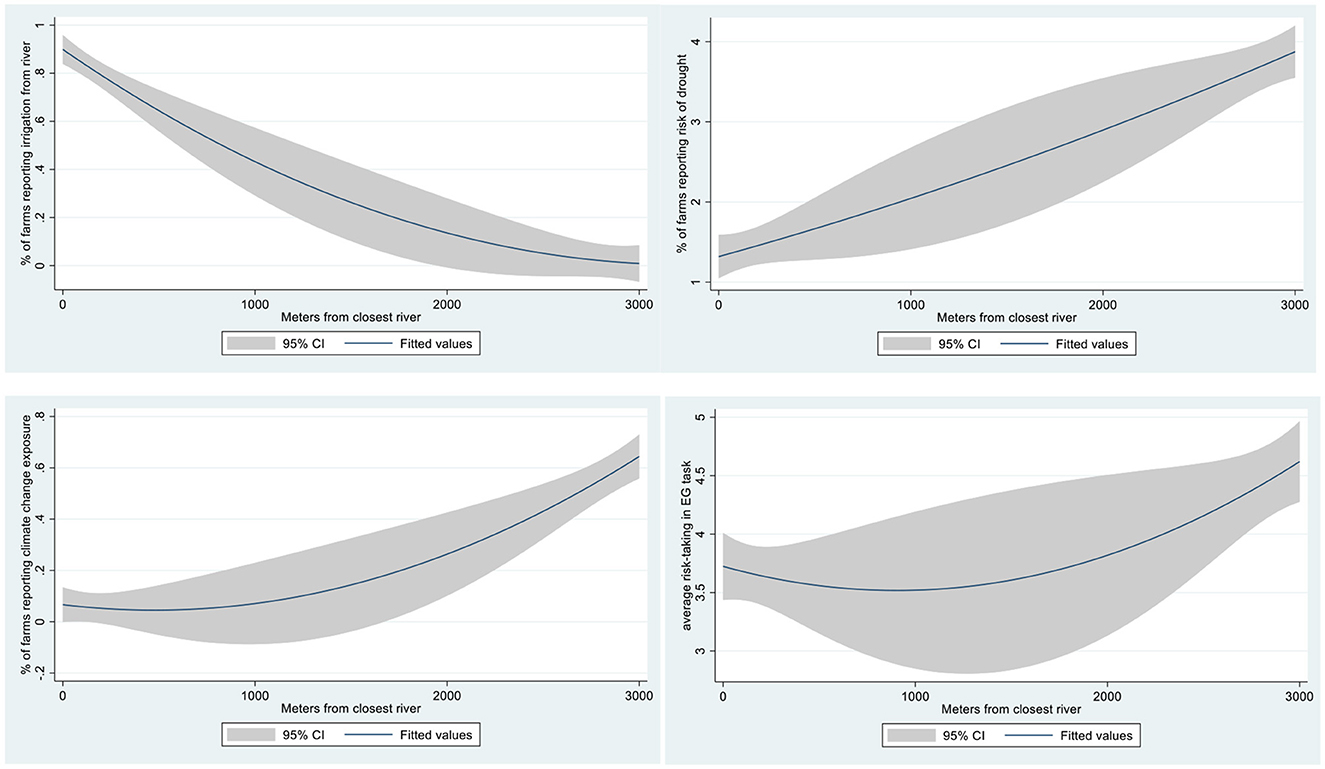 In addition to the experimental risk-taking task decisions and co-variates, our research team also collected GPS coordinates for farmers who participated in this task. Using maps of the districts, we were able to compute the distance of each farm from the closest river or stream (in meters). A potential limitation of using the measure of self-reported exposure to climate change related extremes as our main variable of interest is its non-incentivized nature. In order to investigate the plausibility of this measure and other self-reported measures of farming risk, we use their pairwise correlations with the distance from the closest river. Figure 2 provides graphs for correlations of the distance from the closest river and a set of farm characteristics, namely % of farms using irrigation from a river (top left), % of farms reporting a risk of drought (top right), % of farms reporting exposure to climate change related extremes (bottom left) and risk-taking in the Eckel-Grossman task (bottom right), with all four correlations being statistically significant p < 0.01. This plausibility check shows that participating farmers took our questions seriously and that the self-reported measures appear meaningful. Given that the distance to the closest river is unlikely exogenous due to the immobility of farm(er)s in our study, we establish a relationship between the exposure to climate change-related extremes and greater risk-taking that is likely causal.