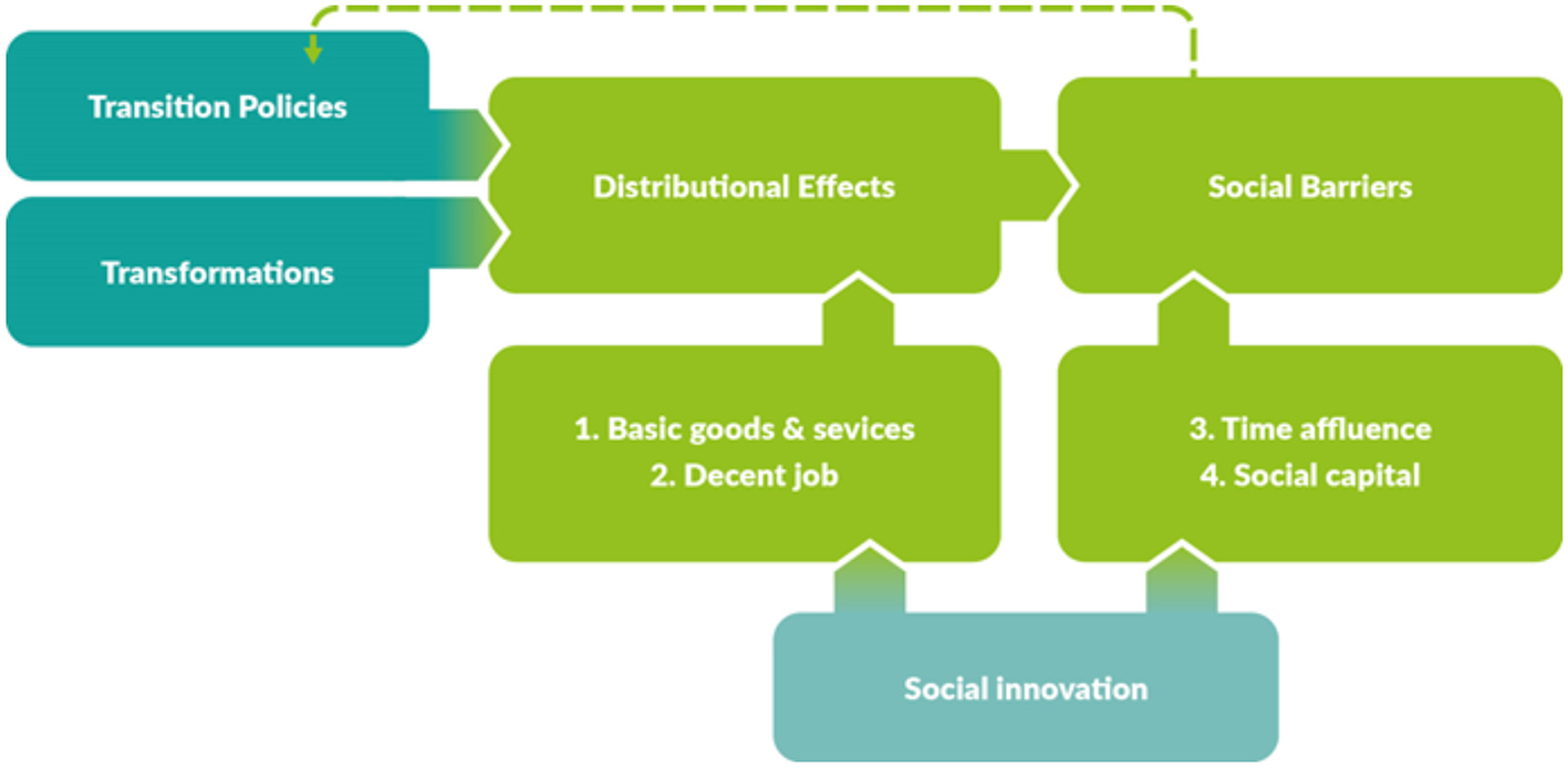 The Ecohesion framework identifies four foundational social conditions (4SCE) that act as enablers of sustainable transitions: access to basic goods and services, decent jobs, time affluence, and social capital. These are not independent policy targets, but co-evolving dimensions of a resilient and equitable socio-ecological system. They operate together to shape societal capacity to support, absorb, and drive systemic transformation. While each relates to economic inequality, they are conceptually and functionally separate from it, as indicated by their positioning relative to economic distribution in Figure 2.