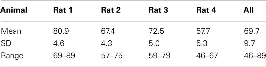 We observed that rats occasionally used their paws to collect the stimulus. This could lead to stimulus contamination and thereby limit performance. On day 157 we inverted the taste manifold, mounting it on the base plate of the arena instead of hanging down from the lid. Performance temporarily dropped, but fully recovered ∼20 days later. Paw use was nearly completely halted. It did not appear to ultimately enhance accuracy, being at 72% at day 200 (range 67–80%). For comparison to the results of Youngentob et al. (1990) we include Table 5, displaying the mean, SD, and range for each rat over training days 181–200. Across all rats performance accuracy (PC) was 70 ± 10%. Actual behavior of rat 1 during 15 trials using this setup on test day 215 is shown in the Video S1 in Supplementary Material.