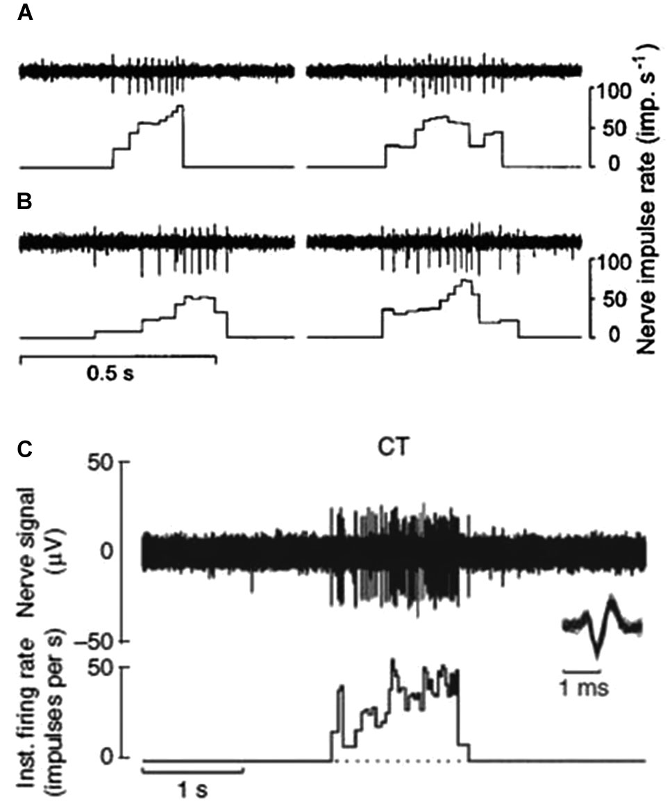 Figure 1. CT afferent response to slowly moving mechanical stimulation. (A and B) Responses of two separate units to the experimenter stroking his finger tip over the receptive field. Peak impulse rates were 78 and 64 imp/s (A) and 52 and 73 imp/s (B) (Vallbo et al., 1999). (C) Microneurography recording of nerve response and interspike interval histogram for another single CT afferent to soft brush stroking with a velocity of 3 cm s-1 and calibrated normal force of 0.4 N. Individual nerve spikes are superimposed on an expanded time scale below the nerve recording to illustrate the typical C impulse shape with a prominent negative peak (Loken et al., 2009).