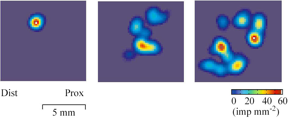 Figure 2. Field geography of CT afferents on the forearm skin. Color coded two-dimensional density plots of receptive fields of three CT afferents. The colors represent intensity of afferent firing. The geography of receptive fields was explored with a robotic scanning method: a lightweight probe with a small and rounded tip was made to scan the field area in a series of closely adjacent tracks while single unit activity was recorded (Wessberg et al., 2003).