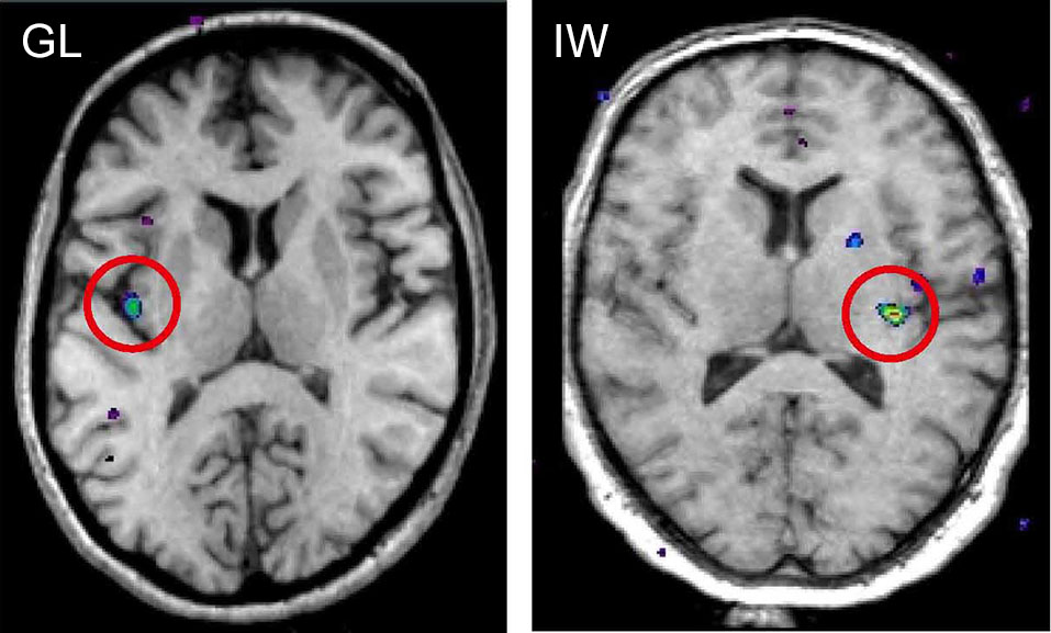 Figure 4. fMRI activation in posterior insular cortex evoked by selective stimulation of CT afferents in the neuronopathy subjects GL and IW lacking Aβ afferents. In both subjects, the posterior insular activation was contralateral to the stimulated forearm and reflects differences in blood oxygen level dependent (BOLD) signal during soft brush stroking and a baseline condition of rest (Olausson et al., 2002; Olausson et al., 2008).