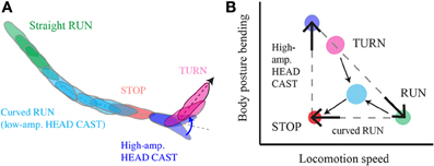 Figure 9. Multilevel control of progression and reorientation in larval chemotaxis. (A) Schematic diagram of a typical motor sequence composed of a curved run followed by a turn. Low-amplitude head casts coupled with forward locomotion induce curved runs through weathervaning, interrupted by a stop and large head casts prior to the implementation of a turn. (B) Phase-space representation of translational (forward progression) and rotational (body bending) variables that encompasses a kinetic description of larval behavior; the run-stop-cast-turn model approximate a discrete action sequence emerging from a continuum that includes straight runs (green), low-amplitude casts (cyan) and weathervaning (cyan), high-amplitude casts (blue), turns (magenta), and pauses in locomotion (orange). The odor gradient modulates the interplay between behavioral variables in a multilevel manner that constraints the dynamics that real trajectories occupy in the phase-space.