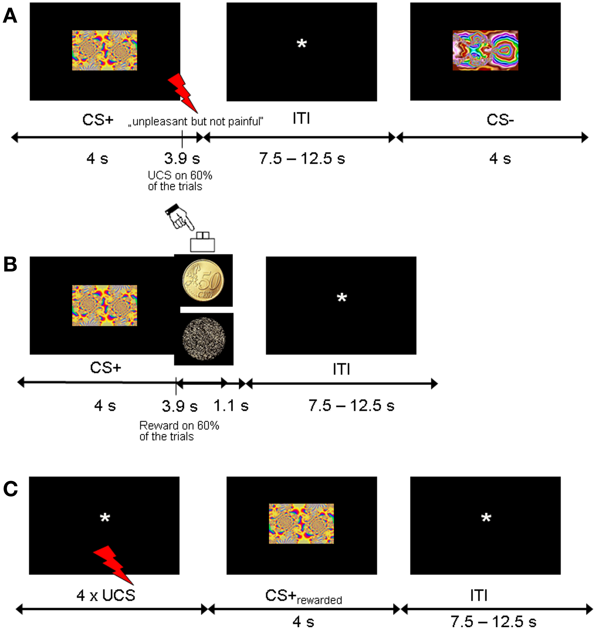 Experimental design. (A) Trial sequence for the fear acquisition phase. CS+ were followed by the shock UCS in 60% of trials. (B) Trial sequence for the counterconditioning phase. Half of the CS+ and CS− stimuli from the acquisition phase were coupled with monetary reward with 60% contingency, and the other half were never followed by reward. (C) Trial sequence for the reinstatement phase. To test for fear recovery, four UCS were unexpectedly given at the beginning of this phase. None of the CSs were followed by shock or reward.