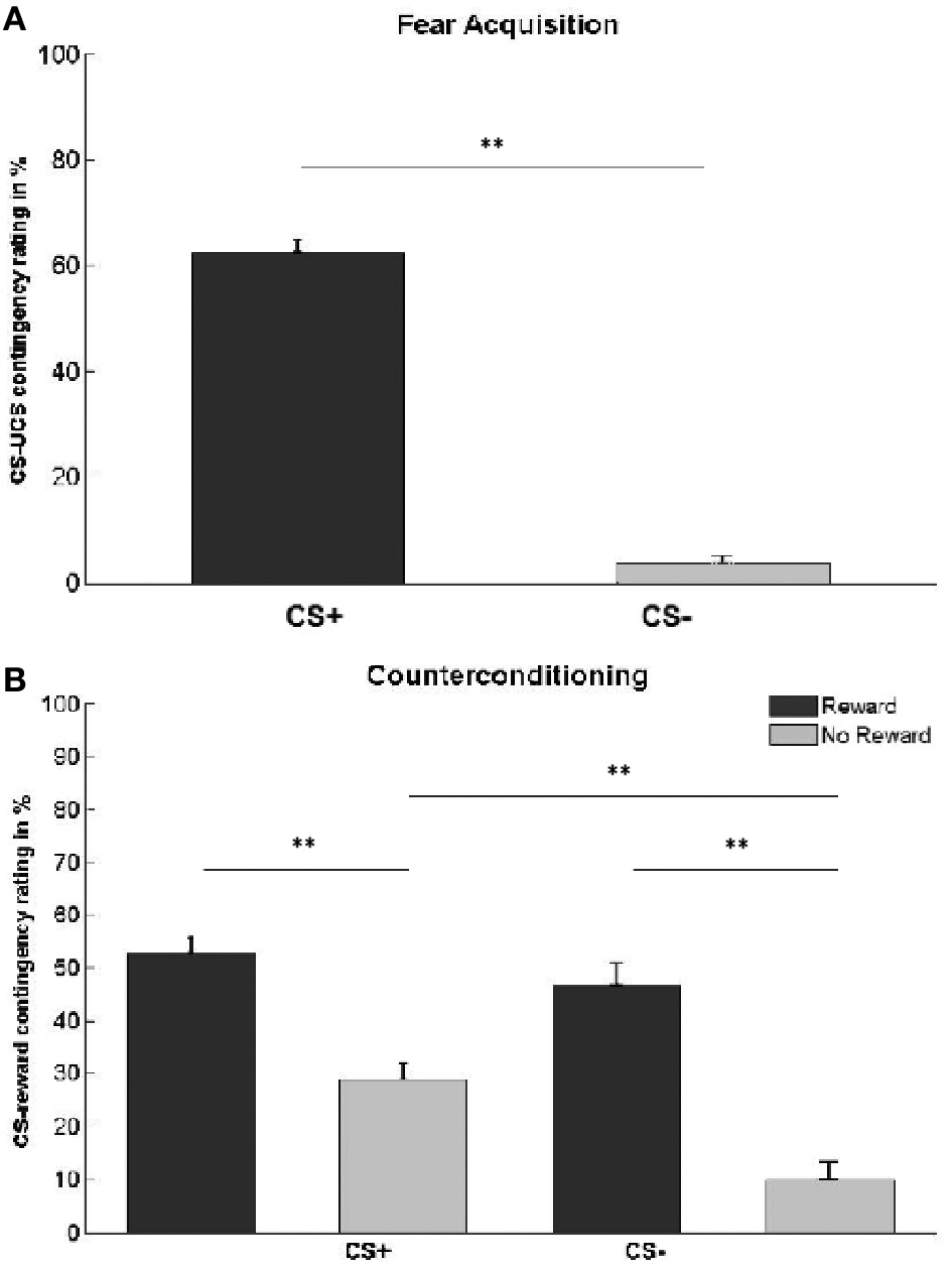 Contingency awareness ratings. (A) Subjects' estimation of the percentage of trials in which each CS type was followed by the UCS. Actual contingencies were 60% for CS+, 0% for CS−. (B) Subjects' estimation of the percentage of trials in which each CS type was followed by reward. Actual contingencies were 60% for rewarded stimuli (dark gray bars), 0% for unrewarded stimuli (light gray bars). Asterisks indicate significant difference (**p < 0.01). Error bars represent standard error.
