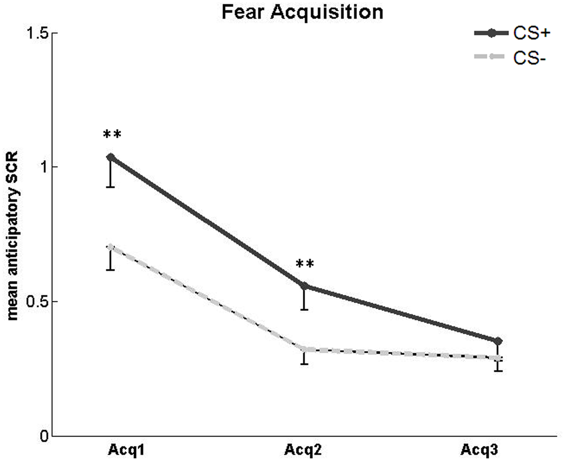 SCR in the acquisition phase. Significantly higher mean SCR to unreinforced CS+ compared to CS− in the first and second, but not third, fear acquisition (Acq) run. Asterisks indicate significant difference. Error bars represent standard error.