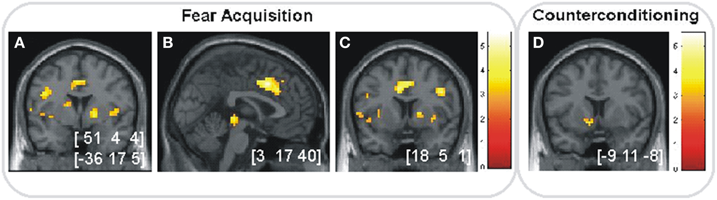 Anticipation of fear and reward. (A–C) Significant activations (p < 0.05, SVC) in the fear acquisition phase for CS+ vs. CS− in (A) bilateral insular cortex, (B) right dACC and (C) right striatum. (D) Significant activation (p < 0.05, SVC) in the counterconditioning phase for rewarded vs. unrewarded cues in left ventral striatum. Images are shown in neurological orientation at p < 0.005 (uncorrected), for visualization purposes. Color bars indicate T-values. Peak coordinates are given in MNI space.