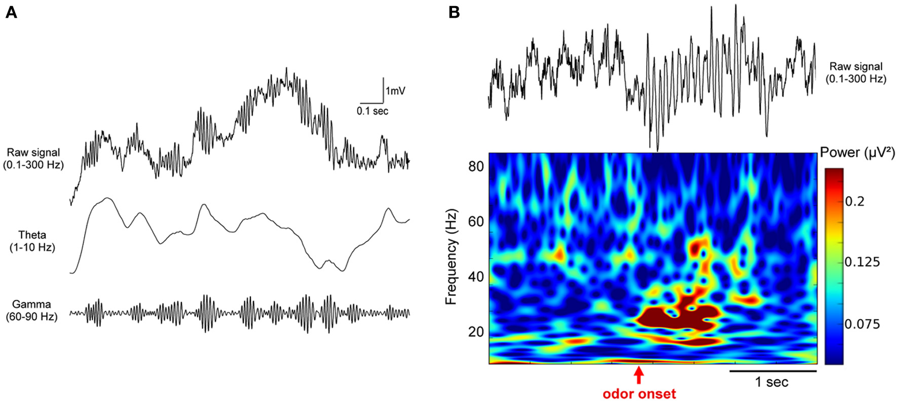 Odor stimulation modifies beta (15–35 Hz) and gamma (60–90 Hz) oscillations in the olfactory bulb. Example of LFP traces recorded in the olfactory bulb in freely moving mice. (A) Raw LFP signal (0.1–300 Hz) on first row is filtered in the theta (1–10 Hz) and the gamma (60–90 Hz) bands, showing the close relation between gamma bursts and the respiratory modulation. (B) Raw LFP signal (0.1–300 Hz) and corresponding time-frequency power representation in a mouse conditioned in a Go/No-Go task. Time-frequency plot was obtained based on Morlet wavelet analysis. It represents the power of the signal (as indicated by the color scale) as a function of time (x-axis) for each frequency (y-axis). Odorant onset is indicated by the vertical red arrow. Note that odor elicits an overall decrease in the gamma band and an increase in the beta band power.
