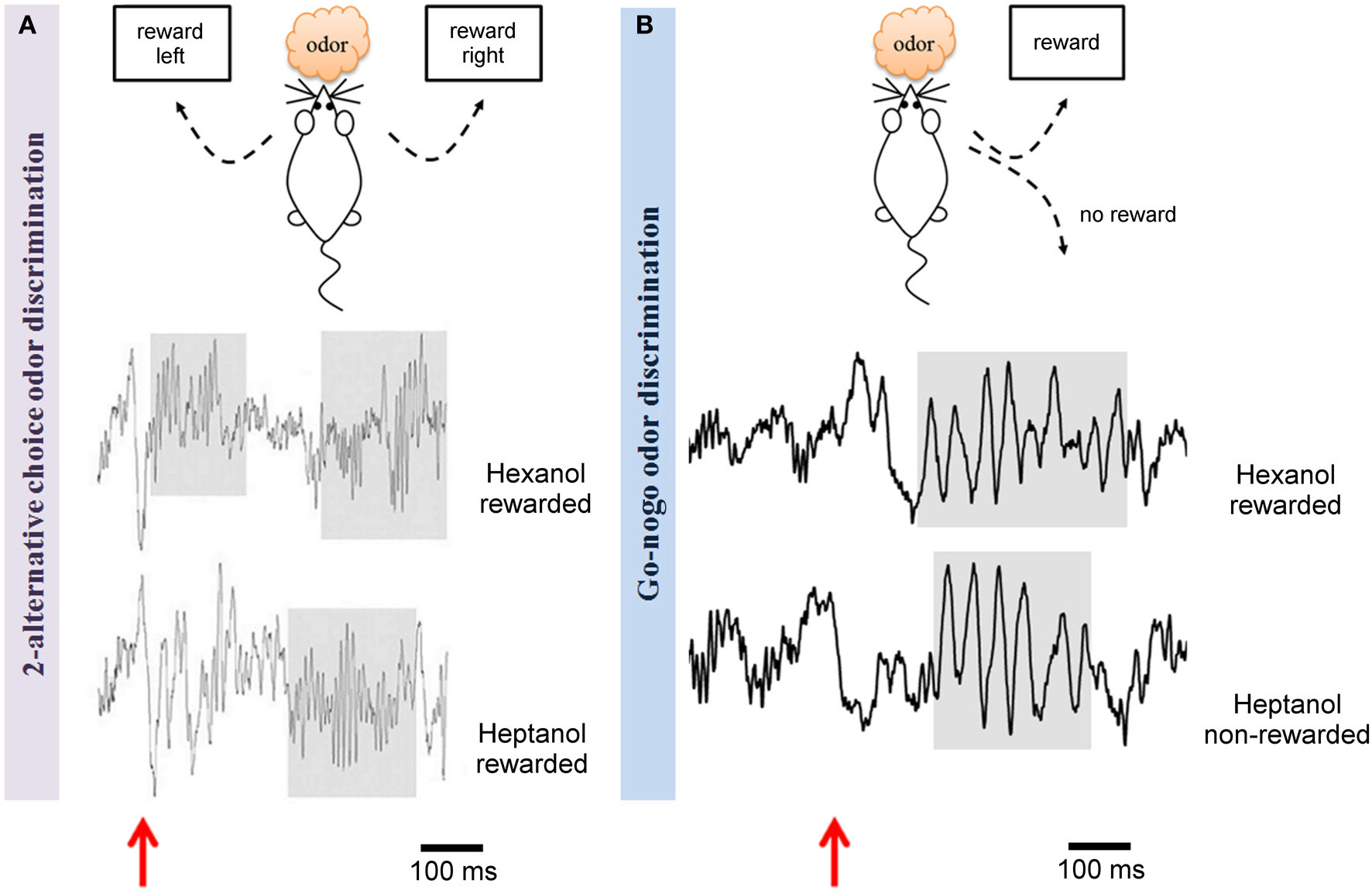 Odor discrimination in two different behavioral tests led to distinct rhythms in the olfactory bulb. Example of raw LFP traces recorded in the olfactory bulb during a criterion session of discrimination between two alcohols (hexanol and heptanol) in two different paradigms: (A) a two-alternative choice test (Beshel et al., 2007) or (B) a Go/No-Go test (Martin et al., 2007). The two tests are schematized on the top. The main difference is that both odors are rewarded in the 2 alternative-choice whereas one odor is not rewarded in the Go/No-Go. In both cases, the same odor concentration is delivered. Odorants are generated in glass test tubes by bubbling air (100 ml/min) through a column of pure odorant and injecting the odorized air into a carrier air stream (400 ml/min) via a computer-controlled olfactometer achieving ~20% saturated vapor. LFPs recorded during odorant sampling periods are displayed, red arrows pointed out odorant onset. As underlined by shaded regions, in the two-alternative choice test, odors evoke high gamma power (65–85 Hz) whereas in the Go/No-Go context, odorant sampling is associated with a strong beta wave (15–40 Hz). It has to be noted that both rewarded and unrewarded odors trigger beta rhythm in the Go/No-Go test.