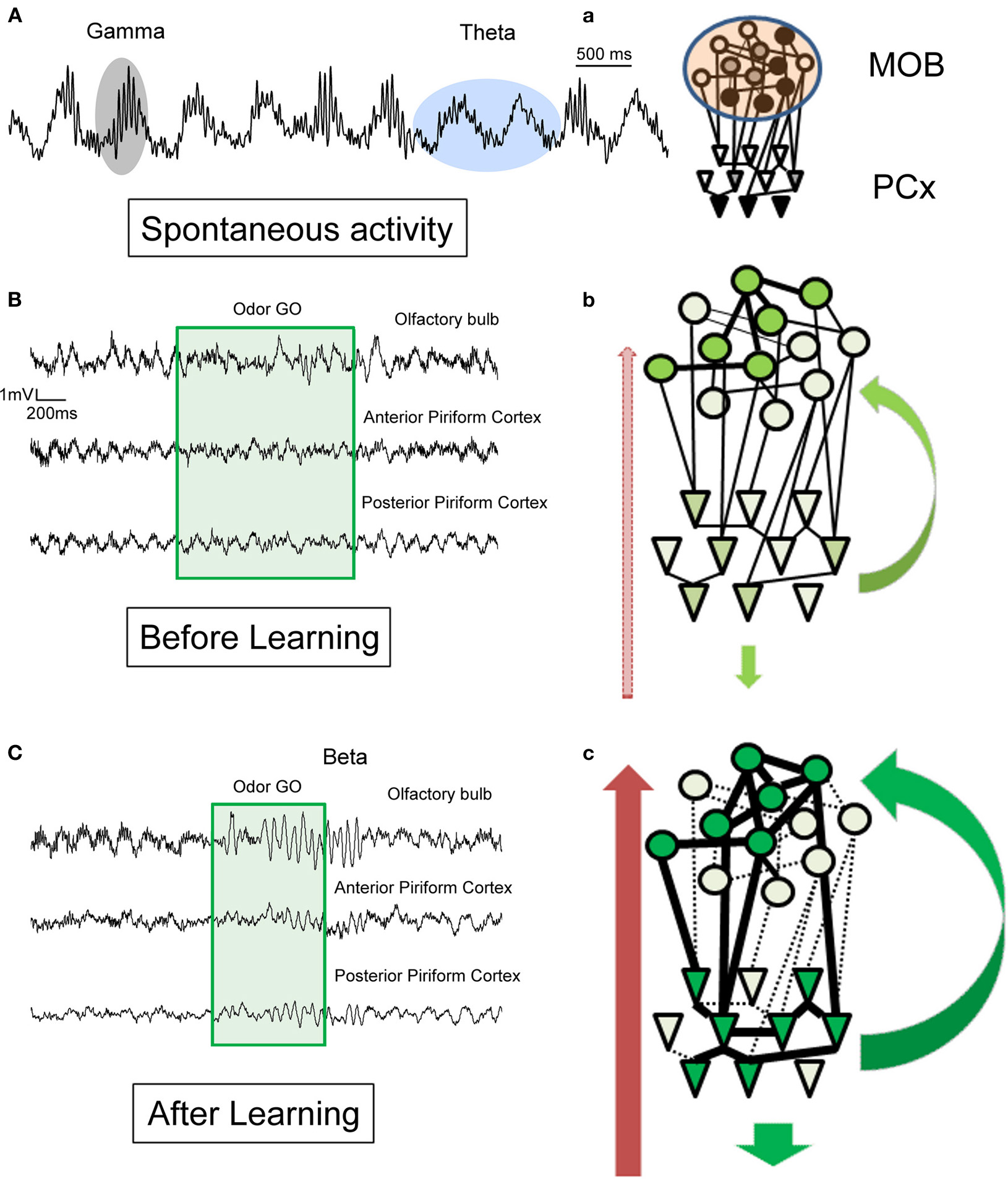 Schematic illustration of hypotheses for the generation of beta (15–35 Hz) and gamma (60–90 Hz) rhythms in the olfactory bulb and the piriform cortex in awake behaving animals. Example of raw LFP traces recorded (A) in the MOB in the absence of olfactory stimulation and (B) in MOB and two different regions of the PCx before learning and (C) after learning during a conditioned discrimination paradigm (Go/No-Go). a–c: Corresponding schematic representation of MOB and PCx interconnected networks and centrifugal modulation. The level of neuromodulation is represented by the red arrow on the left, the level of cortical feedback by green arrow on the right. (A) Spontaneous activity: in the absence of olfactory stimulation. Observe the regular theta respiratory modulation (around 2 Hz) and the associated bursts of gamma activity (60–90 Hz). See also in (B) and (C) the portion just preceding the odorant sampling (green square area) how the gamma bursts decrease in the posterior part of the PCx compare to the MOB and anterior part of PCx. a: In the absence of olfactory stimulation, the level of activation in both networks is weak and variable and both structures are dominated by theta and gamma activity. Gamma activity is transmitted from the MOB to the PCx. (B) Before learning: during odorant sampling, occurrence of gamma bursts is reduced but recovered after the animal has left the odor port. b: During this phase, a population of mitral cells of the MOB becomes active, this input is transmitted to a corresponding population of pyramidal cells. Both neuromodulatory and cortical feedback are exerted on the networks. However, no real coordination is set up in the network. (C) During training: In addition to a strong and sustained decrease in gamma activity, a clear beta oscillation is observed in the MOB and two regions of PCx associated to odorant sampling. c: During this phase, we propose that both assemblies of active mitral cells and pyramidal cells reinforce their connections. The result could be a more efficient and rapid transfer of olfactory information. This coordination is under the influence of both cortical feedback and neuromodulatory fibers as suggested by the results we observed with lidocaine inactivation of the peduncle (Martin et al., 2006). Once synaptic contacts are established, if the training is maintained to get over training, the amplitude of beta oscillatory activity decreases. On the contrary, if the animal is left in his home cage for a long interval without training and tested again, both structures exhibit a very strong beta oscillatory activity.
