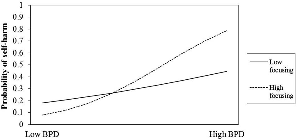 In the final step of the regression odds ratios indicated that BPD features most strongly predicted likelihood of self-harm, and no mediating effects of the added attentional control variables were indicated. Focusing and shifting variables were associated with prior self-harm likelihood. Higher shifting scores were associated with lower rates of self-harm, and focusing appeared to have a positive association with self-harm. These associations were independent of BPD and raise the possibility that they may interact with BPD features in their association with self-harm. The positive association between self-harm and focusing is in the opposite direction to that shown in simple t-tests (Table 1), and may suggest a suppressor effect of either affect or BPD that is only apparent when analyzed together in a regression. Alternatively, there may be an interactive effect of BPD and focusing, and this, along with a similar interaction between shifting and BPD was explored.