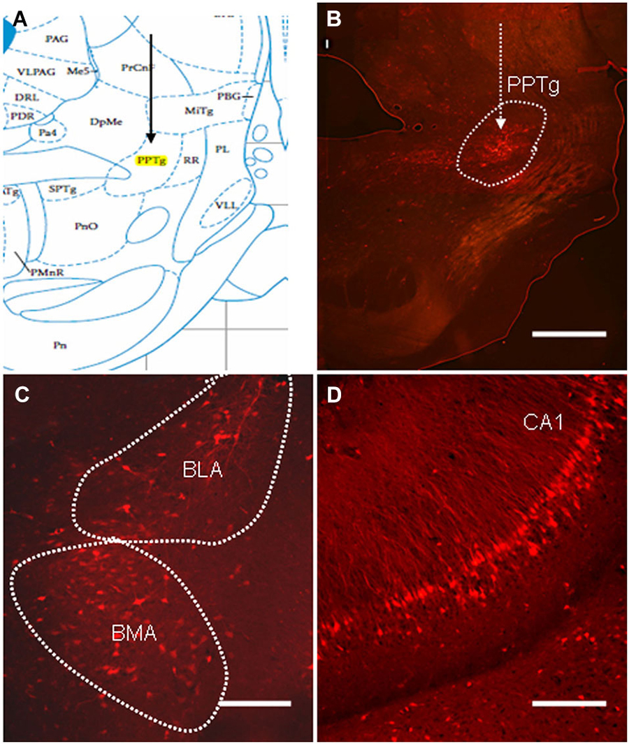 Figure 4. The distribution of PRV614-mRFP trans-synaptically labeled neurons in regions known to mediate PPI after 4 days of infection. (A) A schematic map of the midbrain (PPTg is highlighted in yellow). (B) PRV614-mRFP labeled neuron distribution is restricted to the PPTg near the injected site. (C) Trans-synaptically labeled neurons in the BLA and the basomedia amygdala (BMA). (D) Trans-synaptically labeled neurons specifically distributed in the CA1 of the ventral hippocampus. Scale bar in B = 1 mm; scale bars in C and D = 200 µm.