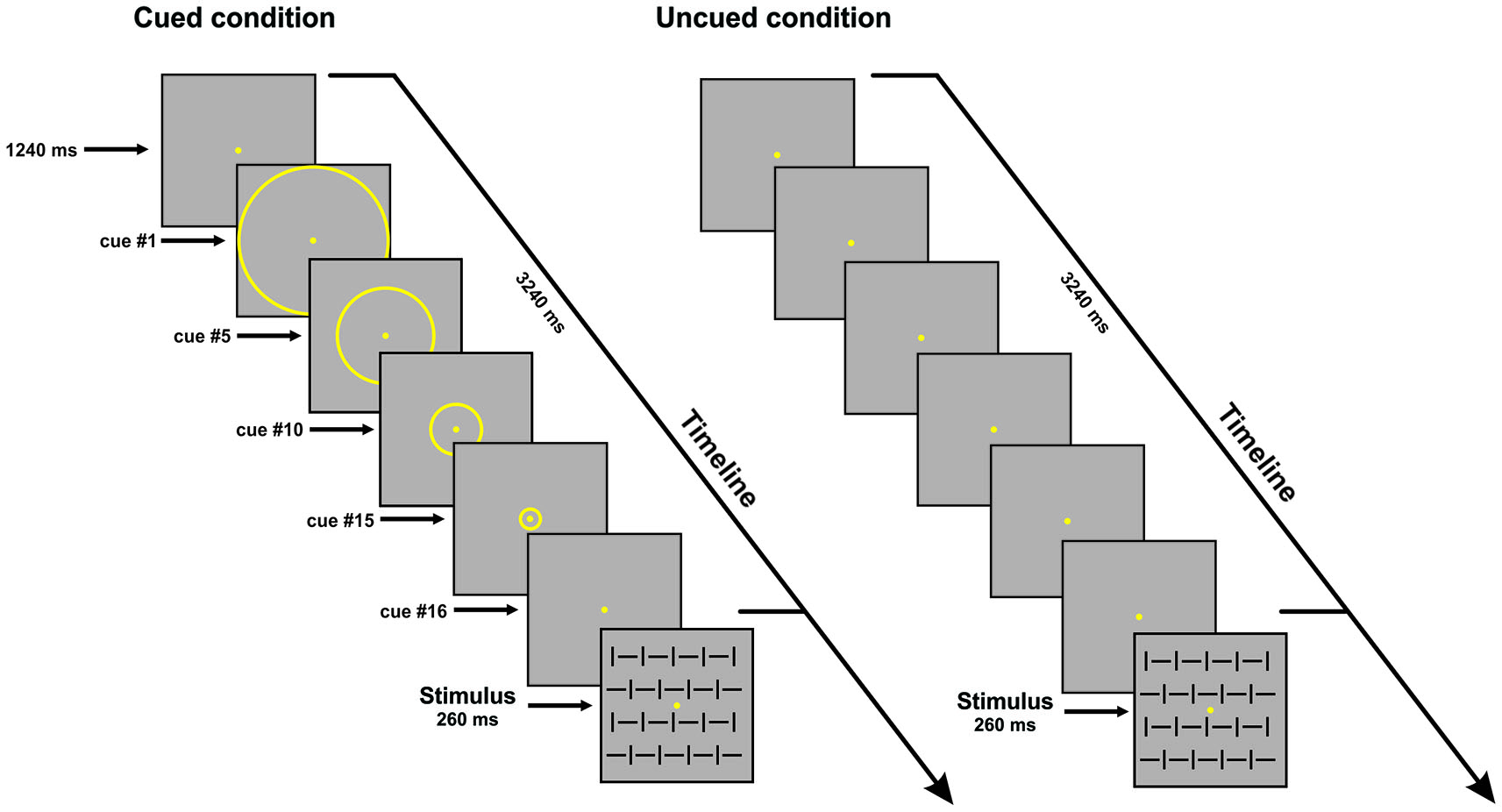 Schematic illustration of the time sequence of events in one trial for the cued (left) and uncued (right) conditions. For both conditions one of the four stimulus configurations is shown; stimulus duration was 260 ms. In the cued condition, 16 circles of progressively decreasing diameter were displayed (125 ms each; overall 2 s); only few examples of these circles are shown in the figure; the subject perceived centripetal motion. inter-stimulus interval (ISI) is 3.5 s. Uncued condition: only the fixation point was displayed. ISI is 3.5 s.