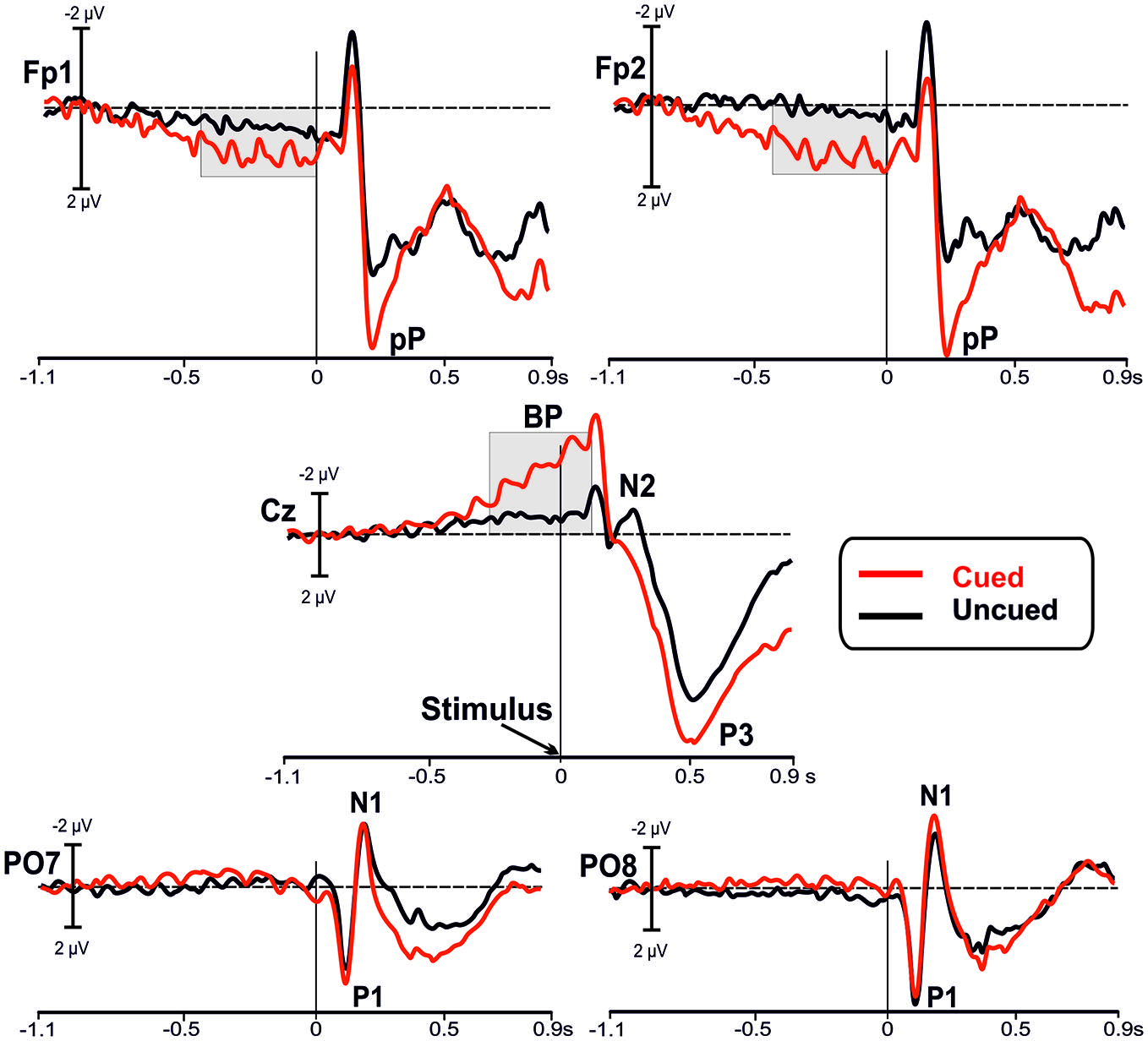 Grand averaged waveforms of the event-related potentials (ERPs) in the in the bilateral prefrontal (Fp1, Fp2), medial central (Cz), and bilateral parietal-occipital (PO7, PO8) electrodes. The waveforms from the uncued (black lines) and the cued (red lines) conditions are superimposed. The main components are labeled in the figures: Bereitschaftspotential (BP); prefrontal positivity (pP); P1, N1 and P3 components.