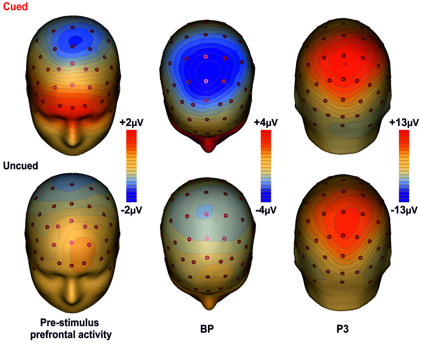 Topographical maps of the ERP components. The maps for the cued task are shown on the first row; the second row shows the maps for the uncued task. The maps report the main cortical activities in different time intervals: Prefrontal activity in the interval −400/0 ms; BP component in the −300/+100 ms time interval; P3 component in the interval 350–600 ms.