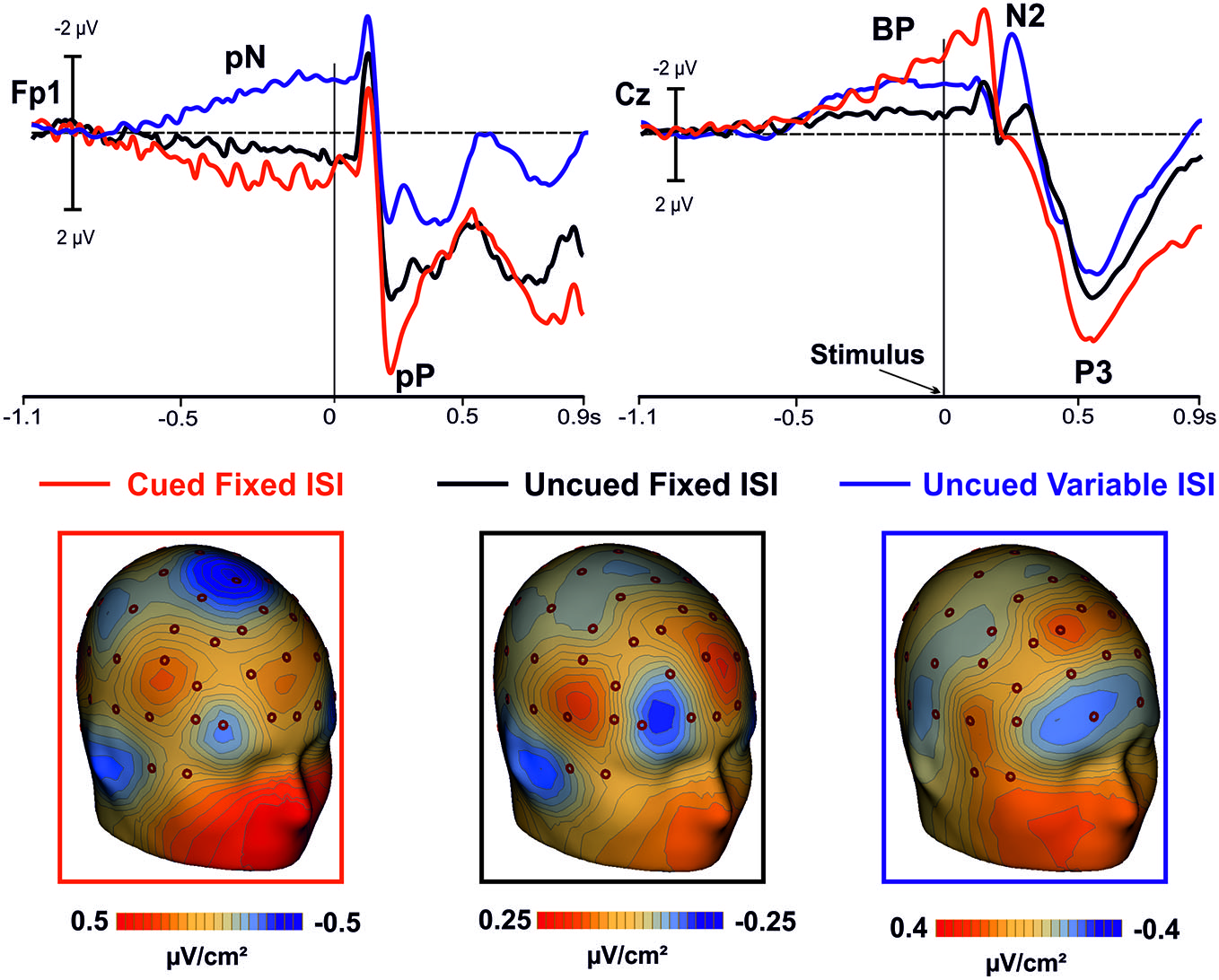 In the top panel, grand averaged waveforms of the ERPs in the prefrontal (Fp1), and medial central (Cz) sites for the cued-fixed ISI (red lines), uncued-fixed ISI (black lines). Data from a similar uncued task but with variable ISI (blue lines) are also shown. In the lower panels, current source density (CSD) maps of the pre-stimulus activity (300/0 ms) over prefrontal regions are displayed.