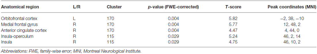 Several studies highlighted the relationship between gray matter volume changes and the BIS scores in healthy controls and subjects at ultra-high risk for psychosis (Matsuo et al., 2009a; Cho et al., 2013; Lee et al., 2013). For example, Cho et al. (2013) found positive correlations between volume of mPFC, dlPFC, OFC, ACC and total, non-planning, and attention/cognitive BIS scores but not with motor impulsivity. Churchwell and Yurgelun-Todd (2013) found a positive linear association between anterior insula thickness and non-planning imulsivity, and both of them had negative correlations with age. Similarly, it has been demonstrated that patients with major depressive disorder, alcoholism, posttraumatic stress disorder, attention-deficit/hyperactivity disorder, antisocial personality disorder or bipolar disorder showed positive correlations between the left, right, and total OFC gray matter volume and BIS motor impulsivity scores and aggression (Antonucci et al., 2006). Our results are similar to these findings, as we found significant positive associations between the FDG-metabolism of the fronto-insular network and the total, non-planning, attention and motor impulsivity. On the other hand, Matsuo et al. (2009a) demonstrated that gray matter volumes of the bilateral OFC and left ACC were negatively correlated with the total BIS scores. More specifically, they found negative associations between the right OFC volume and non-planning impulsivity, and between the left OFC volume and motor impulsivity.