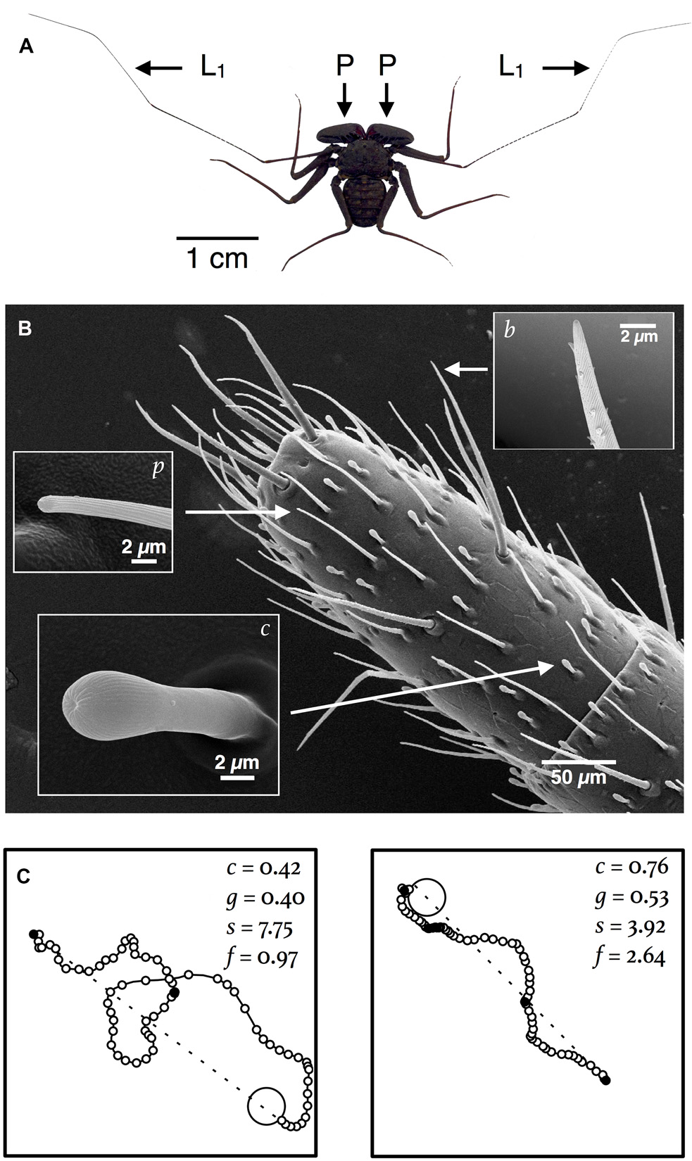 Navigation by amblypygids is hypothesized to rely on sensory information derived from sensilla on the antenniform legs. (A) Image of P. marginemaculatus that shows the (L1) antenniform legs and (P) raptorial pedipalps. (B) SEM of the distal tip of an antenniform leg of P. marginemaculatus, which shows three types of sensilla: c, club sensillum (contact chemosensory); p, multiporous sensillum (olfactory); and b, bristle (mechanosensory and contact chemosensory). (C) In the laboratory subjects readily utilize an artificial shelter. Shown here are nocturnal return routes for two subjects (recorded every 2 s) in a 1-m2 arena. Four kinematic variables used to characterize the paths are listed: c, a circuity index, is the straight line distance (dashed line) from the start point of the return route to the shelter (large open circle) divided by the actual distance traveled; g, a goal orientation index, measures the directedness of the path with respect to the shelter (described in Bak-Coleman et al., 2013); s, the mean linear speed (mm s-1); and f, the frequency of pauses (per minute) in motion (small filled circles) on the route to the shelter.