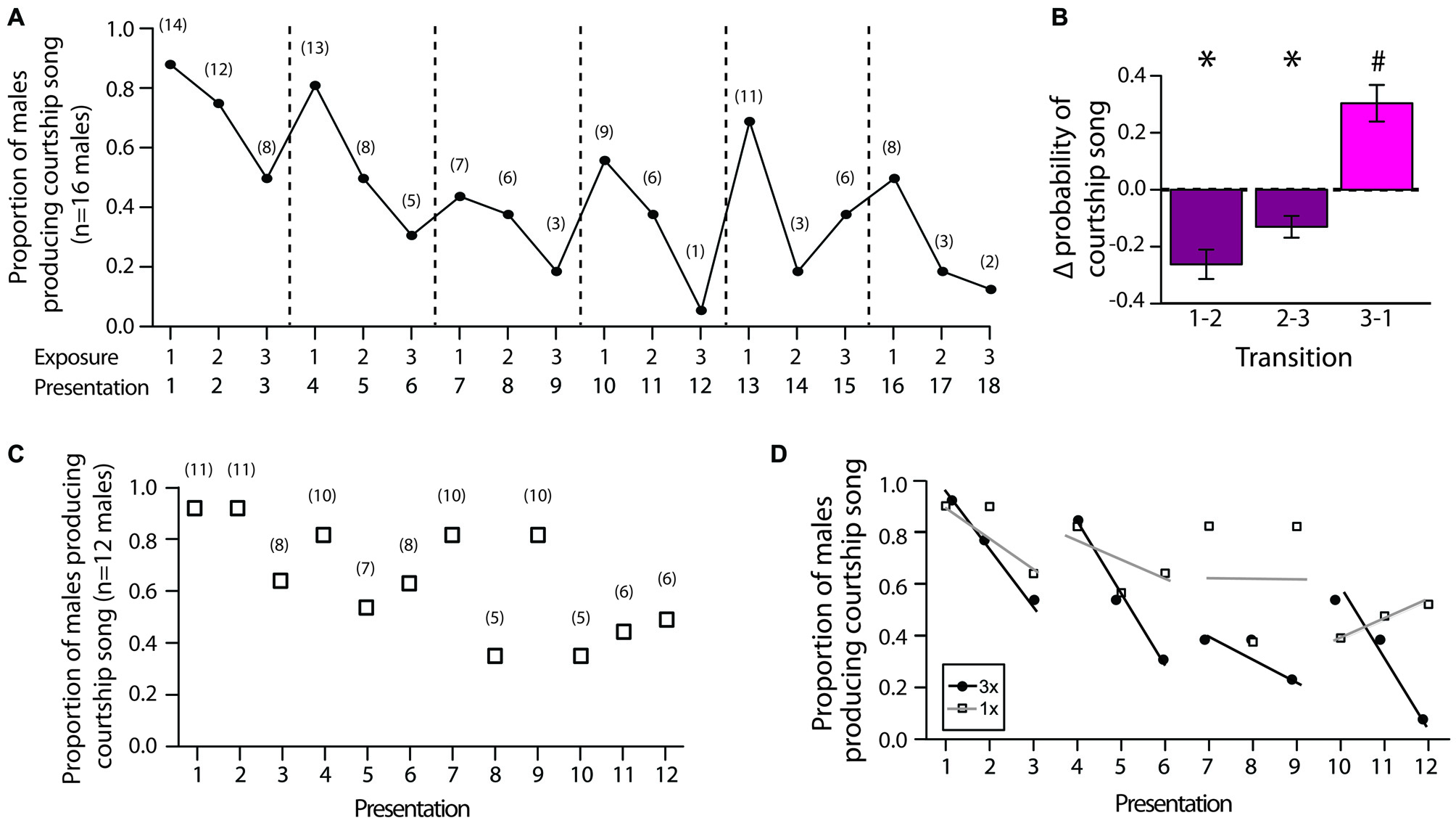 The previous analysis does not rule out the possibility that fatigue could contribute to some extent to changes in courtship song production over the testing session. Indeed, the proportion of males that produced courtship song on their first exposure to a female tended to decrease over the course of the entire testing session, suggesting that fatigue can affect the likelihood of courtship song over the testing period. To further assess the potential contribution of fatigue, we investigated how the proportion of males producing courtship song changed when we switched the stimulus female after single exposures (“1X tests”; n = 13 males). There was generally a linear decrease in the proportion of males producing courtship song across the 12 presentations of stimulus females (F(1,10) = 10.3, p = 0.0093; slope: −3.7 ± 1.1%; Figure 4C).