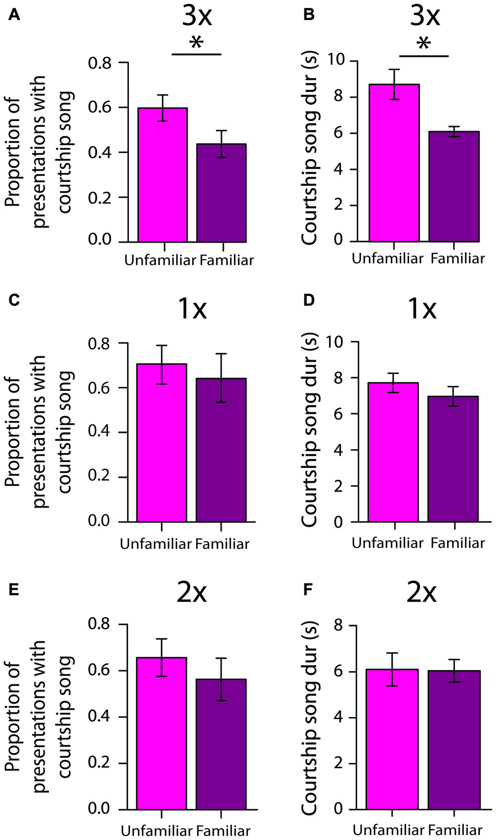 Repeated exposures to females are important for the persistence of social memories over days (longer-term memory tests). (A) When tested 2 days after 3X tests, male Bengalese finches were significantly less likely to produce courtship song to familiar females than to unfamiliar females (n = 13 males; Table 2). Plotted are the average (±SEM) proportions of presentations with courtship song. (B) Two days after 3X tests, males produced shorter courtship songs to familiar females than to unfamiliar females (n = 7 males; i.e., only males that produced at least three courtship songs to familiar females and at least three courtship songs to unfamiliar females). (C) Two days after 1X tests, males did not differentially produce courtship song to unfamiliar and familiar females (n = 7 males). (D) Two days after 1X tests, males produced courtship songs to familiar and to unfamiliar females that were of similar duration (n = 6 males; i.e., only males that produced at least three courtship songs to familiar females and at least three courtship songs to unfamiliar females). (E) Two days after 2X tests, males did not differentially produce courtship song to unfamiliar and familiar females (n = 10 males). (F) Two days after 2X tests, males produced courtship songs to familiar and to unfamiliar females that were of similar duration (n = 8 males; i.e., only males that produced at least three courtship songs to familiar females and at least three courtship songs to unfamiliar females). For all panels, “*” indicates p < 0.05.
