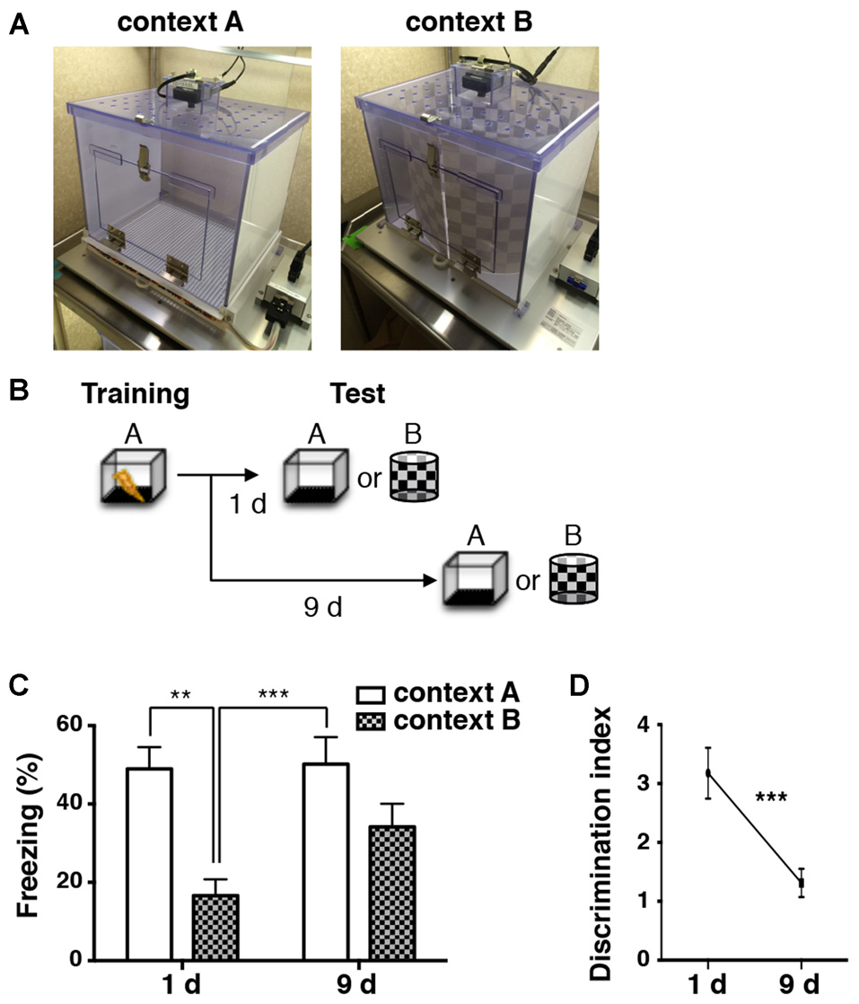Contextual fear memory is generalized over time. (A) Images of chambers used in the fear conditioning experiments. (B) A schematic of the experimental design. Mice were trained for fear conditioning in context A. They were subjected to a memory retrieval test by exposure to either context A or context B 1 day (1d) and 9 days (9d) later. Different groups of animals were used for each test (1d: context A, n = 12; context B, n = 12. 9d: context A, n = 12; context B, n = 13). (C) Percentage of time spent frozen during the retrieval tests in conditioned context A (white bars) and in novel context B (checkered bars) at different time points. Two-way ANOVA followed by Tukey’s multiple comparisons test, **p < 0.01, ***p < 0.001. (D) Levels of the discrimination index at different time points after conditioning. Discrimination of context A and context B was significantly decreased over 9 days after fear conditioning. Unpaired t-test, ***p < 0.001.