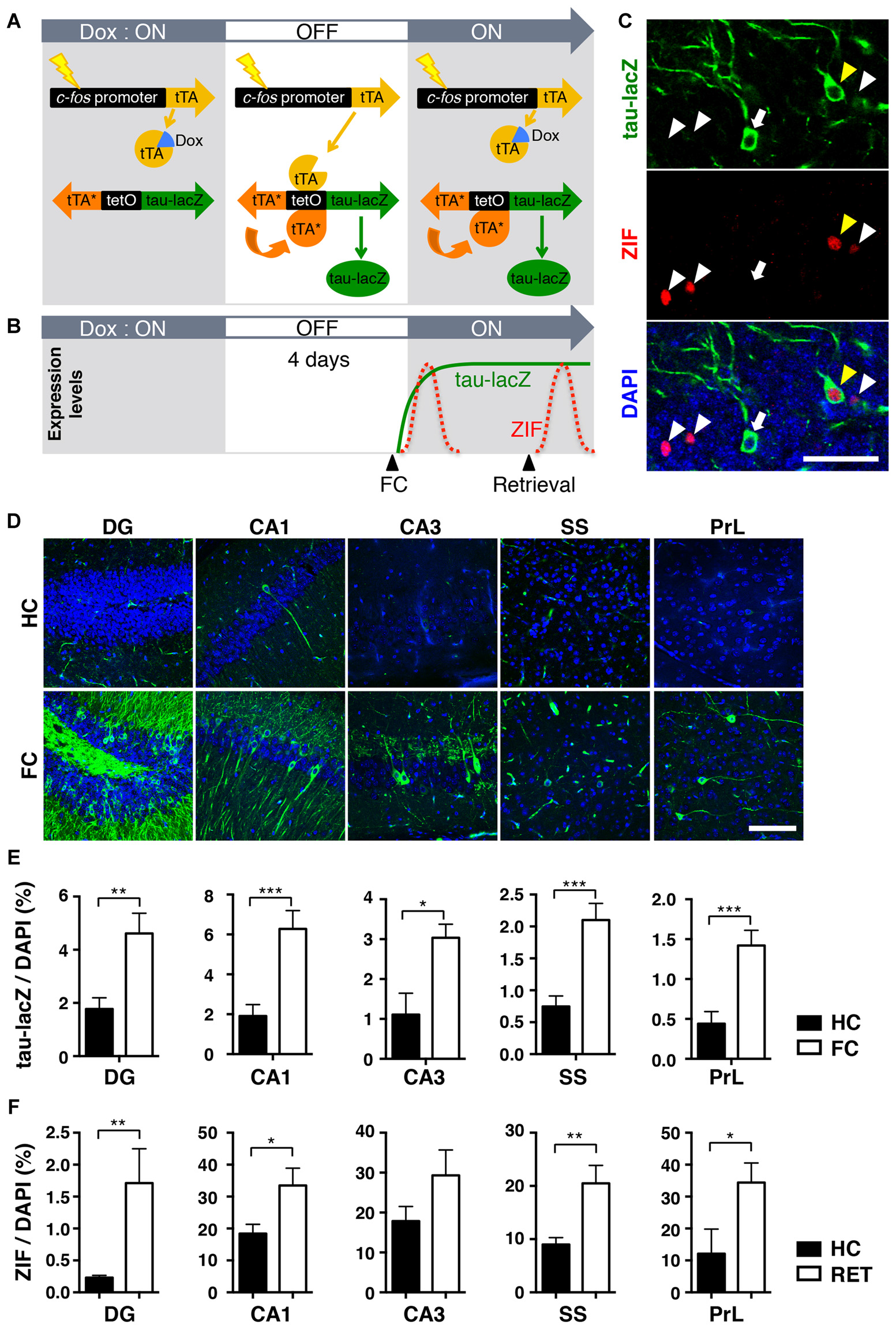The transgenic system used to label neuronal ensembles activated during the acquisition and retrieval of memory. (A) Schematic representation of the transgenic system. When neuronal activity induces activation of the c-fos promoter in the absence of doxycycline (Dox), transactivator (tTA) drives the tetO promoter and induces the expression of tau-lacZ and the mutant tTAH100Y (tTA*). Because tTA* can activate the tetO promoter even in the presence of Dox, neurons once activated during the off-Dox time window will continue to express tau-lacZ. (B) Schematic time-course representation of the genetic tau-lacZ (green line) and the endogenous ZIF (red dotted lines) expressions induced by two separated events. Neurons activated in response to fear conditioning during off-Dox expressed tau-lacZ persistently and endogenous ZIF transiently. Neurons activated by the retrieval test expressed endogenous ZIF, but the tetO-dependent tau-lacZ is not newly synthesized due to the presence of Dox. (C) Representative fluorescent confocal images showing cells labeled with tau-lacZ (green), ZIF (red) and 4′,6-diamidino-2-phenylindole (DAPI; blue) in the dentate gyrus (DG) of the transgenic mice. White arrows: neurons labeled only with tau-lacZ. White arrowheads: neurons labeled only with ZIF. Yellow arrowheads: neurons double-labeled with tau-lacZ and ZIF. Scale bar, 50 μm. (D) Representative fluorescent confocal images showing the expression of tau-lacZ (green) in various regions. Mice were either fear-conditioned (FC) or remained in the home cage (HC) after Dox removal. Scale bar, 100 μm. (E) The proportion of tau-lacZ positive cells in the dorsal DG (HC, n = 11; FC, n = 24), dorsal hippocampal CA1 (HC, n = 9; FC, n = 24) and CA3 (HC, n = 6; FC, n = 21), somatosensory cortex (SS; HC, n = 11; FC, n = 24), and prelimbic cortex (PrL; HC, n = 6; FC, n = 15). Black bars: HC, white bars: fear conditioned. Unpaired t-test: *p < 0.05, **p < 0.01, ***p < 0.001. (F) The proportion of ZIF positive cells in the dorsal DG (HC, n = 13; RET, n = 12), dorsal hippocampal CA1 (HC, n = 11; RET, n = 12) and CA3 (HC, n = 6; RET, n = 10), (SS; HC, n = 13; RET, n = 12), and (PrL; HC, n = 5; RET, n = 7). Black bars: HC, white bars: retrieved. Unpaired t-test: *p < 0.05, **p < 0.01.