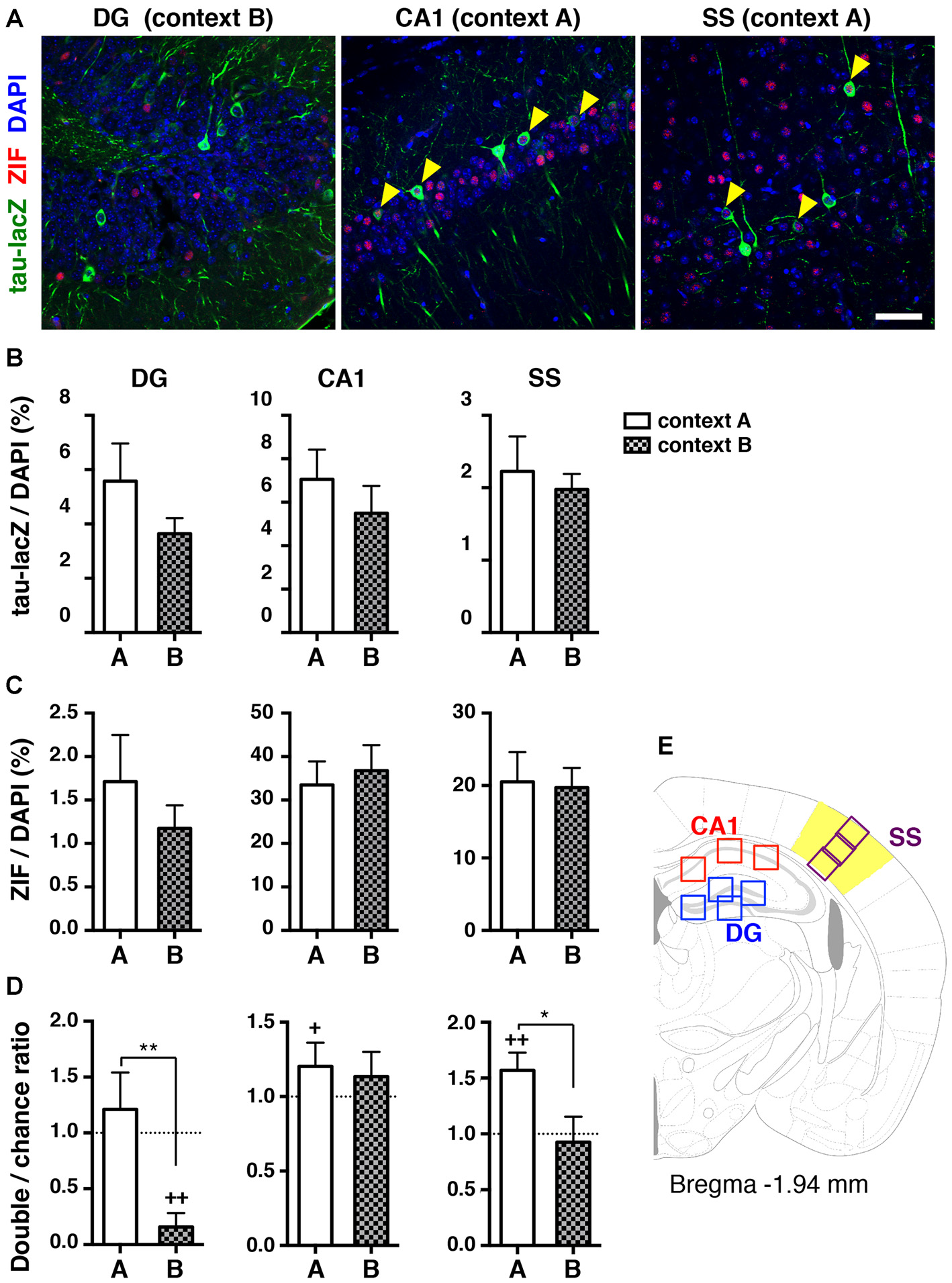 Reactivation of cell ensembles during the retrieval test 1 day after learning. (A) Representative confocal images of immunoreactive cells with tau-lacZ (green) and ZIF (red) in the dorsal DG, the dorsal hippocampal CA1, and the SS. The number of double-labeled cells in the DG was merely detected when mice were placed in context B 1 day after learning (left panel). A significant proportion of double-labeled cells (yellow arrowheads) was found in the CA1 and the SS when mice were re-exposed to context A 1 day after learning (middle and right panels, respectively). Blue: DAPI. Scale bar, 50 μm. (B) Quantification of tau-lacZ positive cells to DAPI positive cells in the DG, CA1 and SS. (C) Quantification of ZIF positive cells to DAPI positive cells in the DG, CA1 and SS. (D) Transgenic animals, which were tested for retrieval 1 day after learning in Figure 1, were used for the ensemble reactivation analysis. The percentage of neurons double-labeled with tau-lacZ and ZIF was compared to the chance level with the Wilcoxon signed rank test in the DG (context A, n = 12; context B, n = 12), the CA1 (context A, n = 12; context B, n = 12), and the SS (context A, n = 12; context B, n = 12). When the double:chance ratio equals 1, the probability that tau-lacZ positive cells overlap with ZIF positive cells is at the chance level. If the ratio is significantly larger than the chance level, neurons were significantly reactivated during retrieval. White bars: context A; checkered bars: context B. Wilcoxon signed rank test; +p < 0.05, ++p < 0.01. Mann Whitney test; *p < 0.05, **p < 0.01. (E) Schematic drawing of a mouse brain coronal section adapted from Franklin and Paxinos (2008), showing the regions of interest selected for measurements.