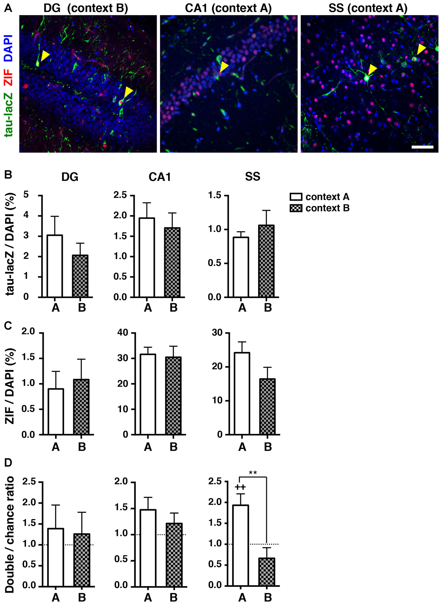 Reactivation of cell ensembles during the retrieval test 9 days after learning. (A) Representative confocal images of immunoreactive cells with tau-lacZ (green) and ZIF (red) in the dorsal DG, the dorsal hippocampal CA1, and the SS. Yellow arrowheads indicate double-labeled cells. Blue: DAPI. Scale bar, 50 μm. (B) Quantification of tau-lacZ positive cells to DAPI positive cells in the DG, CA1 and SS. (C) Quantification of ZIF positive cells to DAPI positive cells in the DG, CA1 and SS. (D) The percentage of neurons double-labeled with tau-lacZ and ZIF was compared to the chance level with the Wilcoxon signed rank test in the DG (context A, n = 12; context B, n = 13), the CA1 (context A, n = 12; context B, n = 12), and the SS (context A, n = 12; context B, n = 11). White bars: context A; checkered bars: context B. Wilcoxon signed rank test; ++p < 0.01. Mann Whitney test; **p < 0.01.