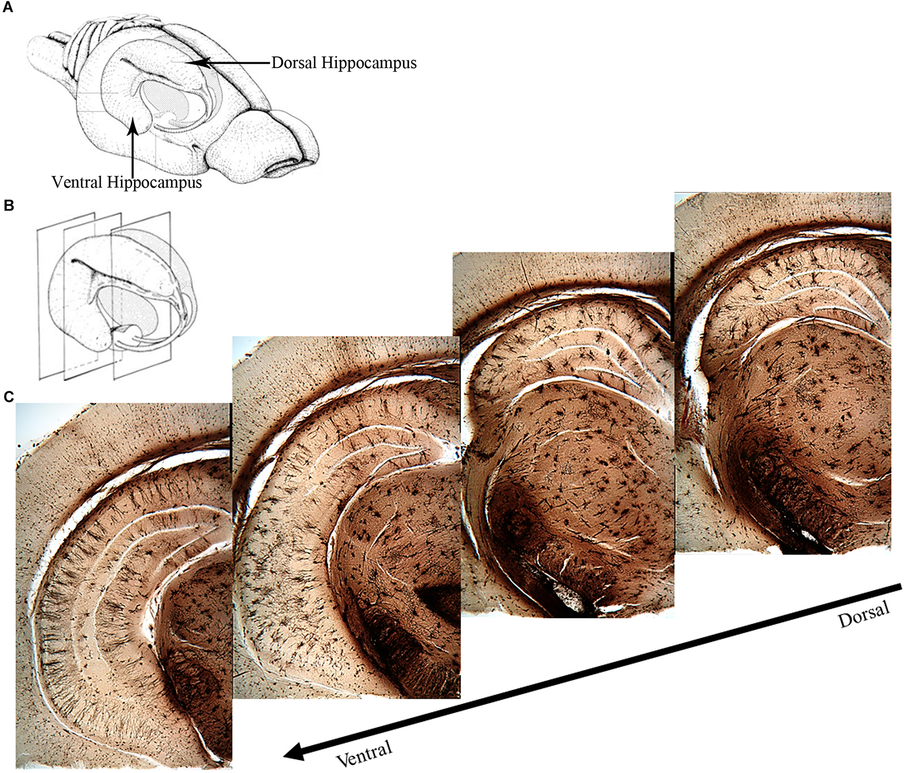 Figure 1. Overview of the rat hippocampus. (A) Drawing of the rat brain showing the three-dimensional organization of the hippocampus and locations of the dorsal and ventral hippocampus. (B) Coronal planes showing approximate locations of the images in (C). (C) Golgi images illustrating the dorsal and ventral aspects of the hippocampus. The dorsal hippocampus is generally thought to mediate cognitive processes such as declarative memory formation and spatial learning and memory functions. Functional mapping studies have suggested that activity in the dorsal hippocampus relates to cortical regions that are involved in higher order information processing. The ventral hippocampus appears to be more involved with functions related to stress, emotion and affect. Neural activity in the ventral hippocampus corresponds to regions involved in emotion and stress (e.g., amygdala and hypothalamus). (A,B) Adapted from Cheung TH, Cardinal RN. Hippocampal lesions facilitate instrumental learning with delayed reinforcement but induce impulsive choice in rats. BMC Neurosci. 2005 May 13;6:36. 10.1186/1471-2202-6-36.; PMCID: PMC1156904. https://openi.nlm.nih.gov/detailedresult?img=PMC1156904_1471-2202-6-36-3&req=4. License information found here https://creativecommons.org/licenses/by/2.0/.