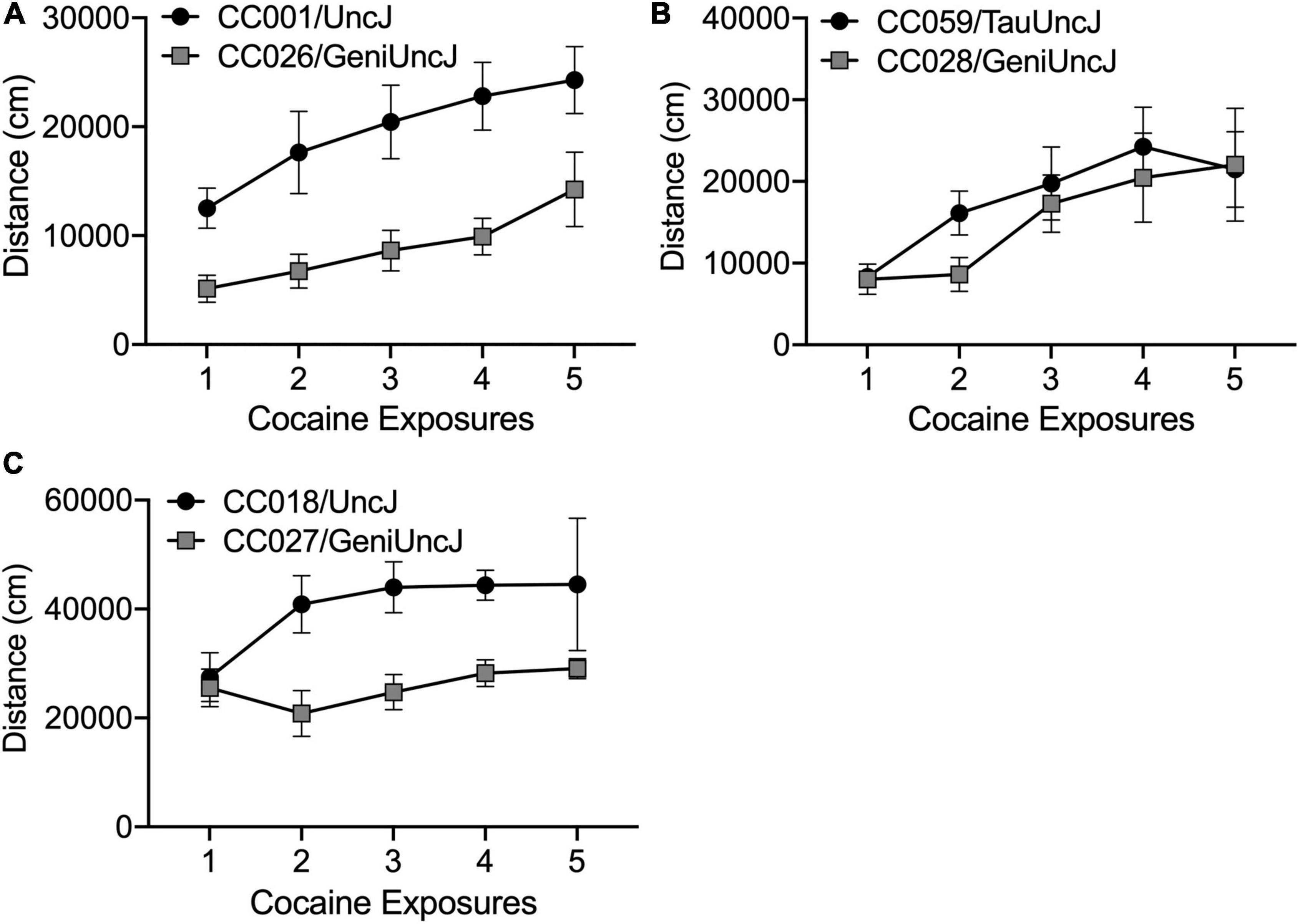 Figure 7. Different patterns of sensitized cocaine locomotor behavior in CC strains of interest. Cocaine exposures 1–5 correspond to Days 3–11 in the sensitization protocol. (A) CC001/UncJ and CC026/GeniUncJ show similar rates of sensitization but differ in overall locomotor response; (B) CC059/TauUncJ mice exhibit a robust sensitization response across the first four exposures while CC028/GeniUncJ mice don’t begin to show a sensitized response until the third exposure and (C) the maximal locomotor response in CC018/UncJ mice is reached by the second dose whereas CC027/GeniUncJ mice show the highest response after a single exposure and locomotor activity does not increase upon additional exposures.