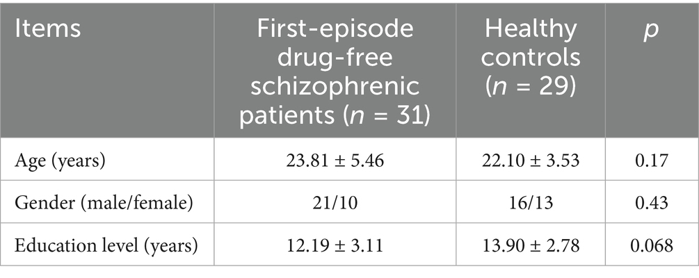 There were no significant differences in age, gender, and education level between first-episode drug-free schizophrenic patients and healthy controls (p > 0.05), and the effects of age, gender, and education level on cognitive function were excluded (Table 1).