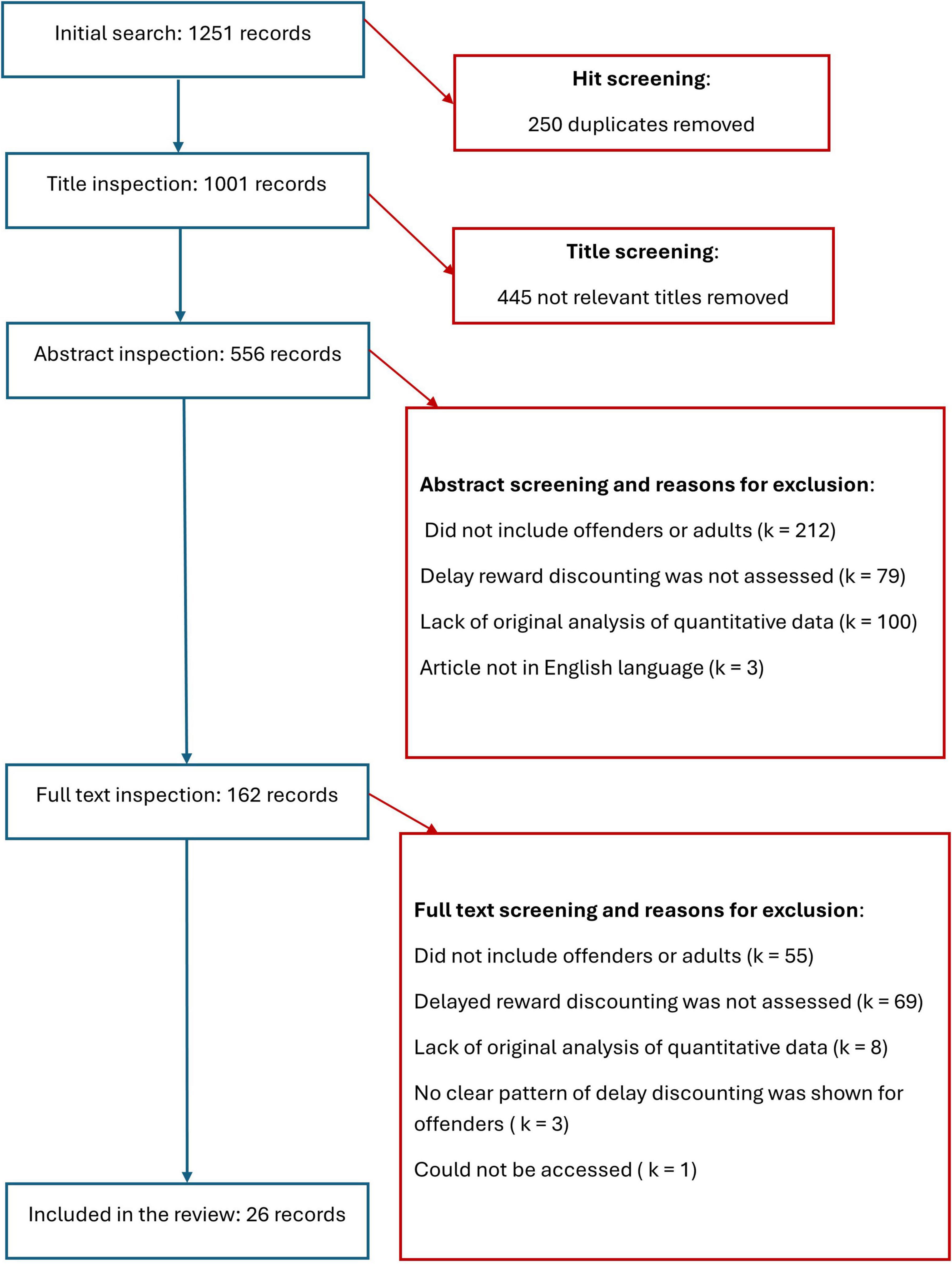 The initial search yielded 1,251 articles, with 250 duplicates. The remaining 1,001 titles were inspected for relevance. After removing 445 non-relevant titles, 556 abstracts were inspected. Of these, 162 were found to be relevant. Following a full-text inspection of the articles, with particular attention to the assessment of criminal conduct and delayed rewards discounting, 26 articles were found suitable for inclusion in the review. Four researchers reviewed the titles, abstracts and full texts, and performed a quality check. One study was identified as having poor quality; however, it was kept in the review to keep transparency and maintain completeness of the results. The details of the excluded studies are presented in Figure 1.