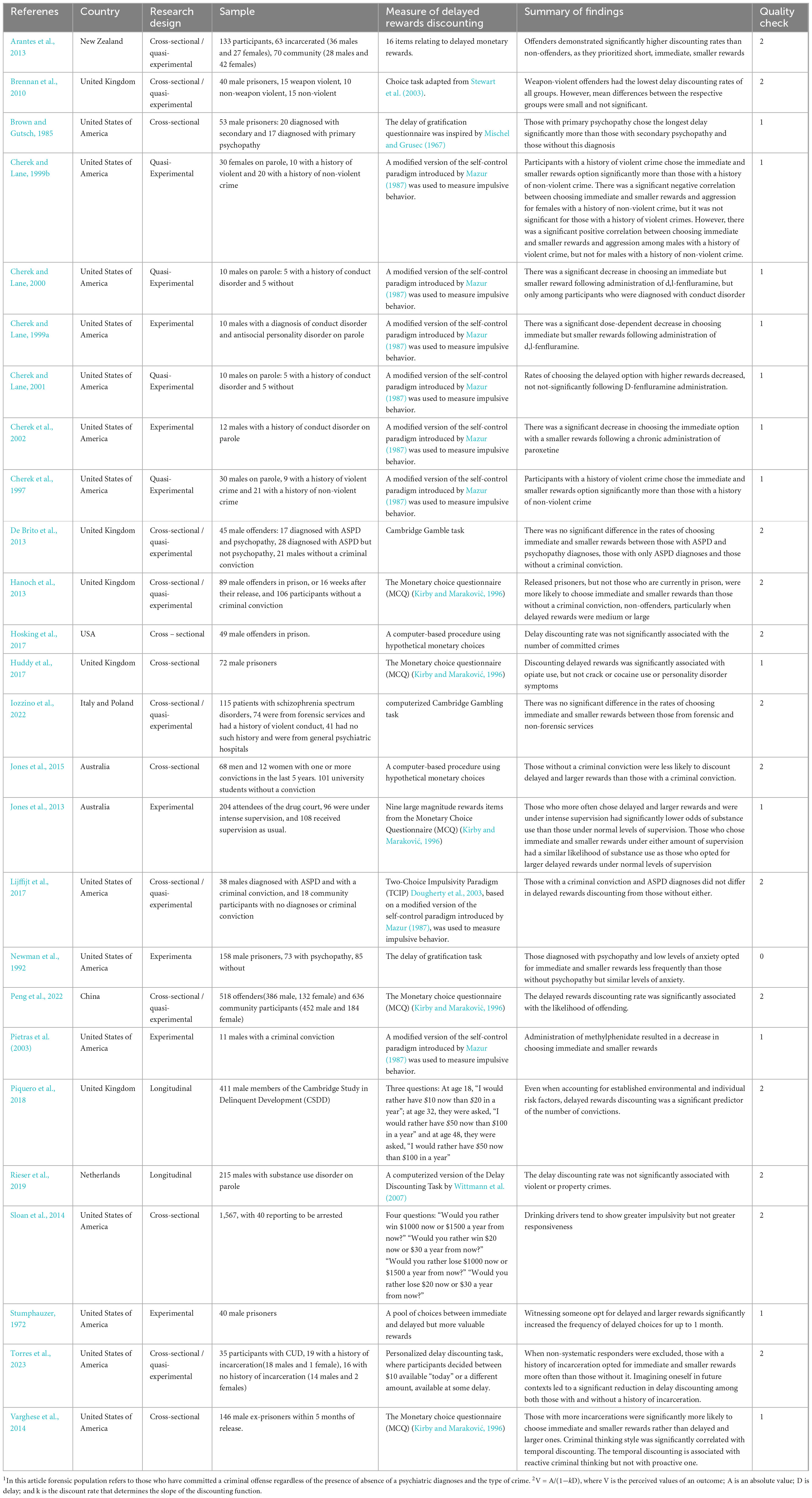 The current review is not without its limitations. Although all the included articles assessed delayed rewards discounting by presenting participants with two choices —one that grants a smaller gain in the short term and another that grants a larger gain in the long term —the particulars differed. Studies differed in the number of choices presented to the participants and the differences observed. This undermined the generalization of the results to the forensic population and could have been the source of the discrepancies in the results. Furthermore, despite the inclusion of female adults with criminal convictions in some of the studies, the majority focused exclusively on males, restricting the inference even further.