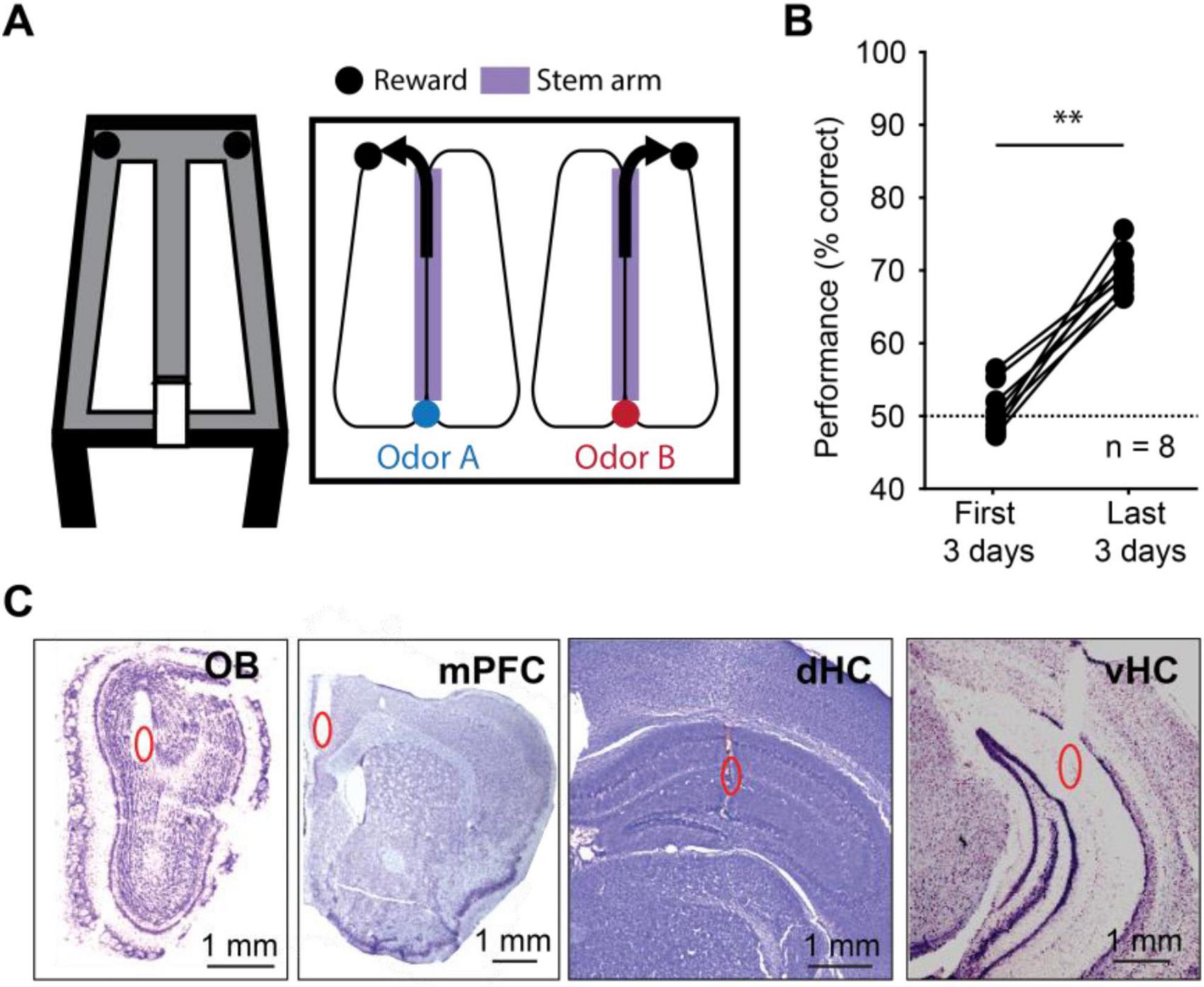 Figure 1. Mice performed an odor-cued working memory task with high accuracy. (A) Schematic of the odor-cued working memory task. Mice were trained to sniff one of two pseudo-randomly delivered odors at an odor port at the bottom of the stem arm and make a turn at the top of the stem arm based on the odor they sampled. The relation between odor identity and turn direction remained consistent for each mouse. A food reward was provided at the reward zones for correct choices, and mice returned to the odor port by running on the side arms. (B) Performance increased between the first 3 days and the last 3 days of behavioral testing (n = 8 mice, Z = 2.45, p = 0.007, one-tailed Wilcoxon signed-rank test). Dashed line, chance level. (C) Example recording electrode locations in the olfactory bulb (OB), medial prefrontal cortex (mPFC), dorsal hippocampus (dHC) and ventral hippocampus (vHC). Recording locations are highlighted (red ovals) in cresyl-violet stained coronal brain slices. **p < 0.01.
