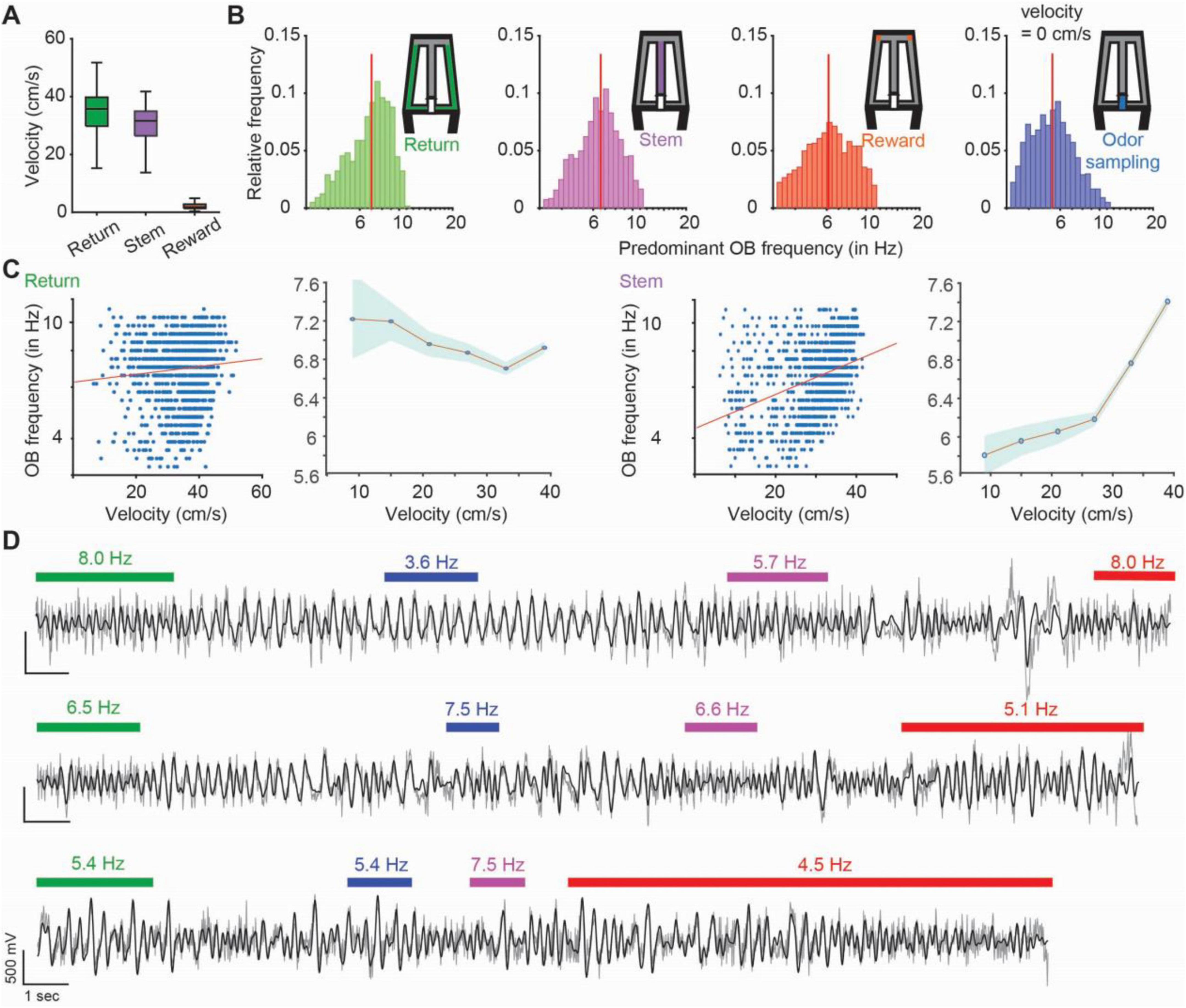 Figure 2. Olfactory bulb (OB) frequencies within each task phase ranged from 3 to 12 Hz. (A) Velocity of the mice (n = 7 mice, 1207 trials throughout the last 3 days of testing in the odor-guided task) in each maze zone. Velocity in the odor port is not shown and was near zero while animals held their nose in the port during odor sampling. In the box plots, the center line shows the median, and the bottom and top edges of the box represent the 25th and 75th percentiles, respectively. The whiskers indicate the most extreme data points. (B) The distribution of predominant OB frequencies across trials is plotted for each task phase. Red vertical line, median. (C) In task segments with substantial running, OB oscillation frequency is correlated to different extents with running speed (return: r = 0.09, p = 0.0017; stem: r = 0.33, p = 2.78e-31). In the plots depicting averages, dots are means and the shaded area is the standard error of the mean. (D) Example OB LFP traces (gray: raw traces, black: 3–12 Hz filtered traces). Each line is a trial, and colored bars indicate time periods when animals were in the respective task phase (green: return arm, blue: odor sampling, purple: stem arm and red: reward zone). Numbers on top of bars indicate the predominant OB frequency. Transition phases are without bars and were not analyzed.