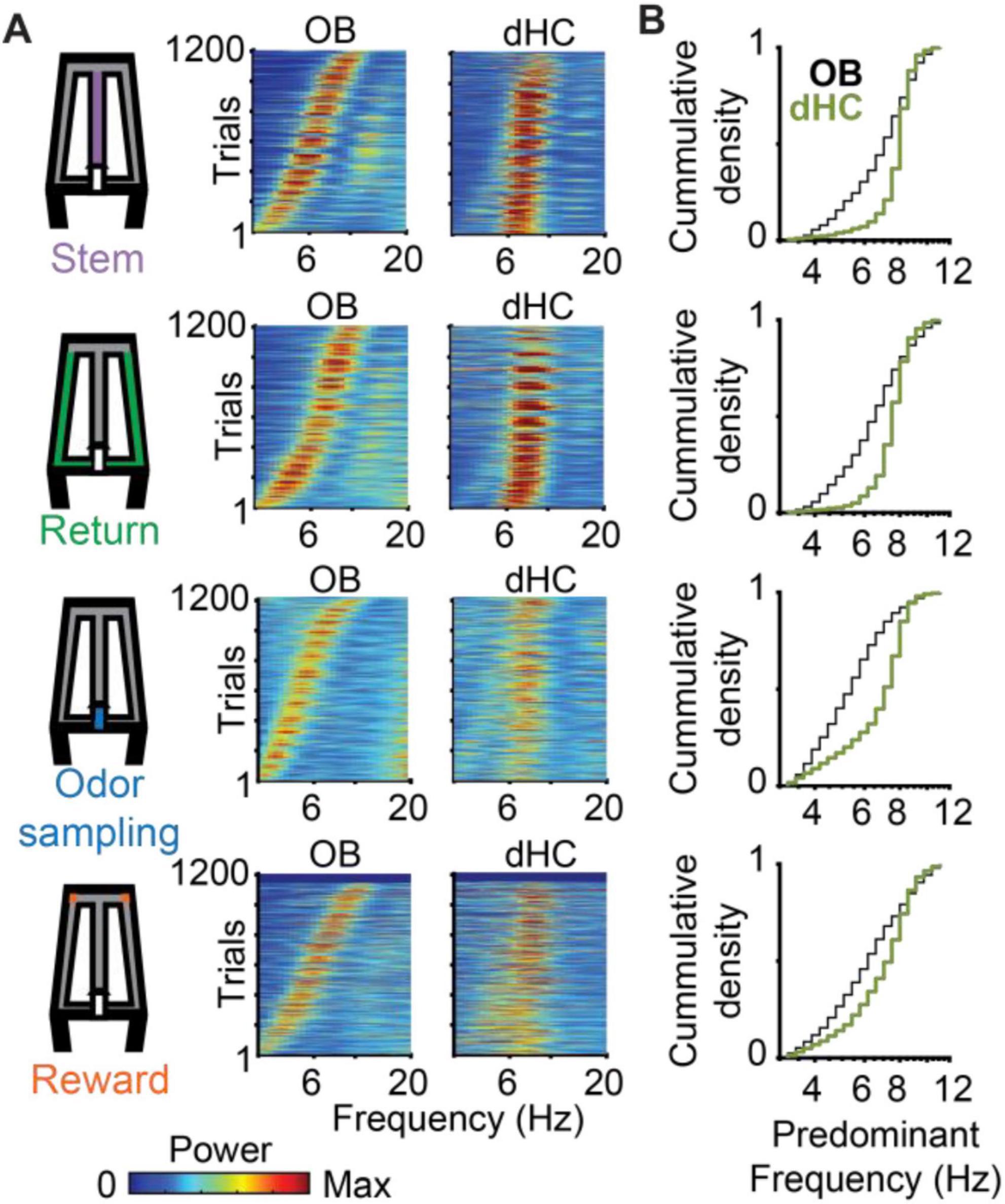 Figure 3. Across trials, predominant OB oscillation frequencies varied so that they were either overlapping or non-overlapping with canonical theta frequencies in dHC. (A) Power spectra of OB and dHC oscillations are shown as color-coded plots, with each line corresponding to a trial. Trials are ordered by the OB peak oscillation frequency. (B) Cumulative density functions of the predominant OB frequencies (black) and dHC frequencies (green) for the four task phases. The data for OB frequencies is replotted from Figure 2A for comparisons with dHC frequencies. Predominant dHC frequencies were concentrated in the range of 7–11 Hz, while OB frequencies spanned the entire range of 3–12 Hz during all task phases. Frequency distributions differed between brain regions in all task phases (n = 1207 trials, return: p = 3.4e-56, KS = 0.32; stem: p = 1.8e-70, KS = 0.36; odor sampling: p = 7.1e-88, KS = 0.41; rewards zone: p = 4.7e-21, KS = 0.20).