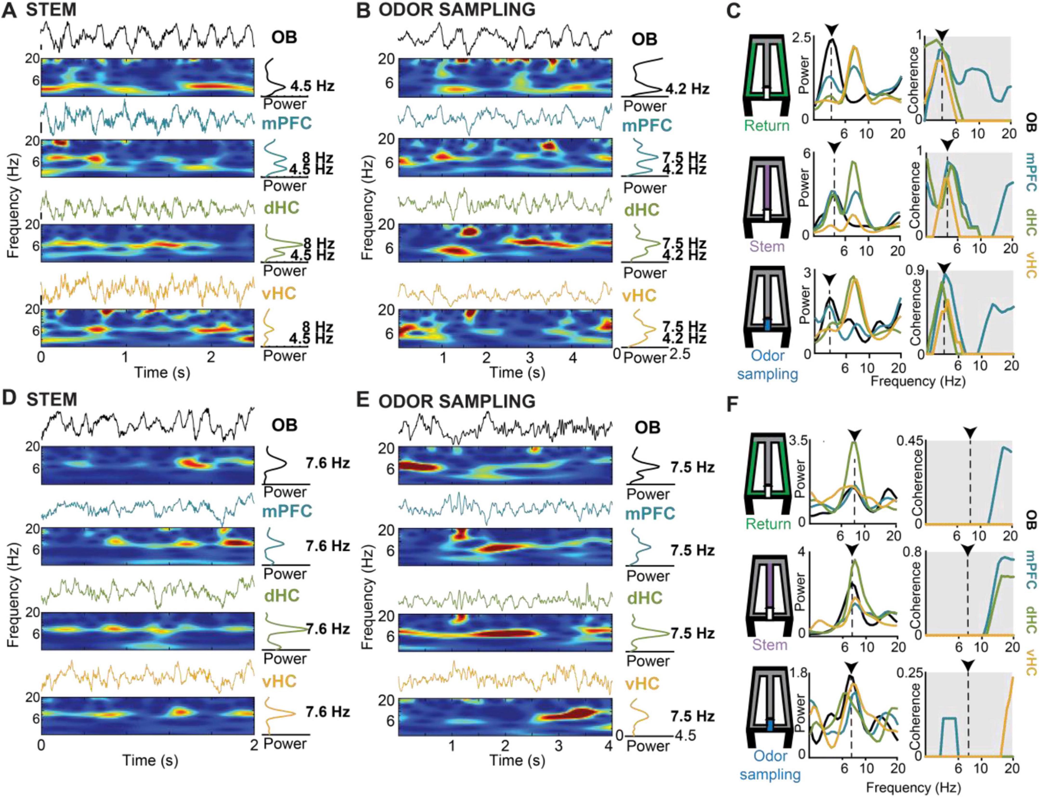 Figure 4. Respiration-related oscillations (RROs) were observed in the mPFC-dHC-vHC network in parallel with movement-related or sensory-evoked theta oscillations. (A) Example raw traces and corresponding time-frequency spectrograms of simultaneously recorded LFP from OB, mPFC, dHC and vHC are shown for a period when the animal was running on the stem arm of the maze. In the example, theta frequency in the mPFC-dHC-vHC regions was non-overlapping with the predominant OB frequency. (B) Arranged as in panel (A) but for an example period when the mouse was stationary while actively sampling odor at the port. As in panel (A), theta and OB frequencies were non-overlapping. (C) Time averaged power spectra (left) and coherence spectra (right) are shown for three example periods within a trial and maze zone (return arm, stem arm and odor sampling period) when OB and canonical theta frequencies were non-overlapping. Dotted lines and arrows indicate the frequency of the predominant OB oscillation in the respective trials. OB-mPFC, OB-dHC and OB-vHC coherence is higher at the frequency matching the predominant OB frequency compared to the theta frequency. (D,E) Arranged as in panels (A,B), respectively, but for example periods when OB and canonical theta oscillations overlapped in frequency. (F) Arranged as in panel (C) but for example periods (return arm, stem arm and odor sampling period) with overlapping OB and canonical theta frequencies. Despite the similar peak frequencies of both types of oscillations, OB-mPFC, OB-dHC and OB-vHC coherence was low at the overlapping frequency range. This is consistent with a lack of coupling between canonical theta oscillations and respiration-entrained oscillations in the mPFC-dHC-vHC network.