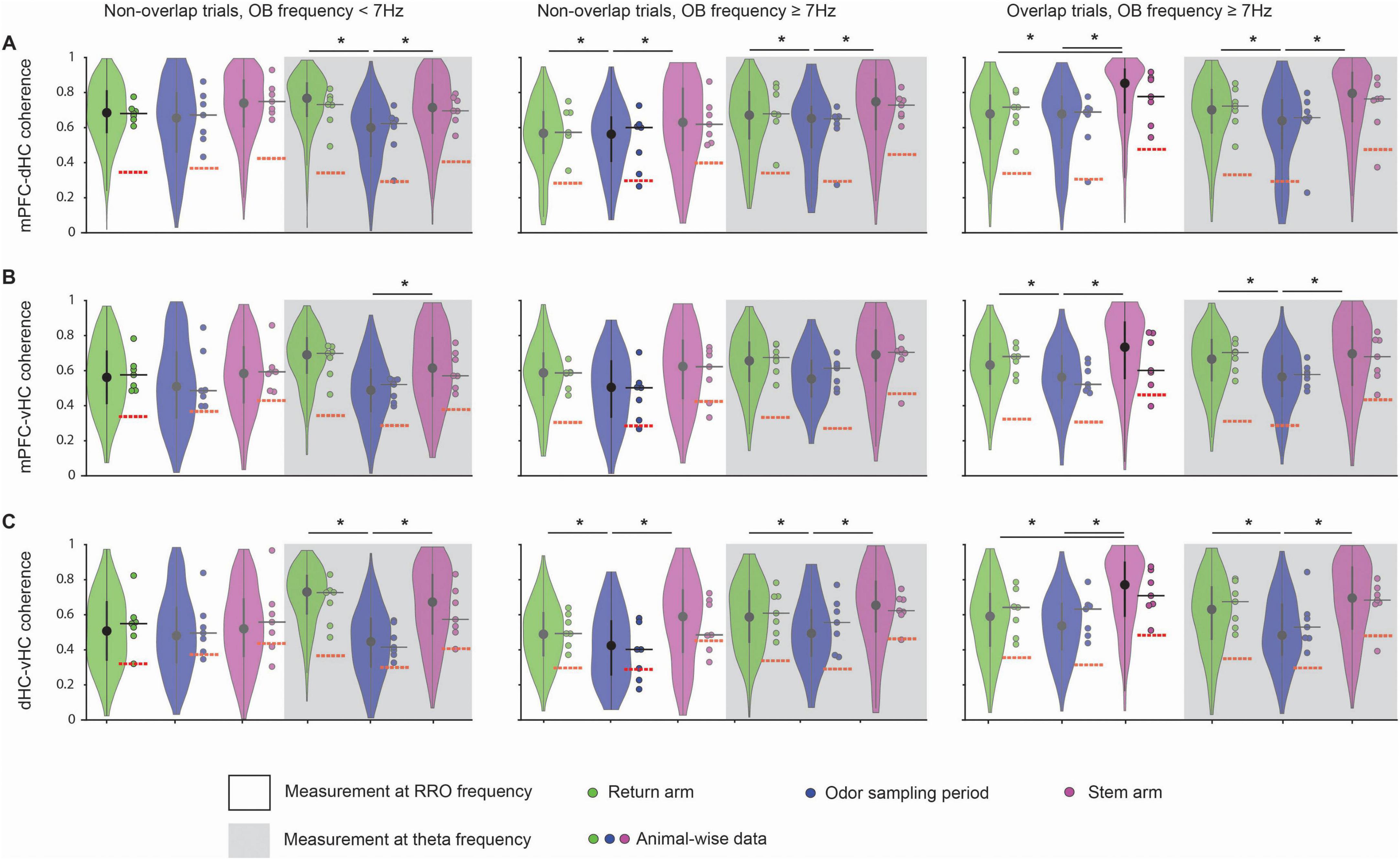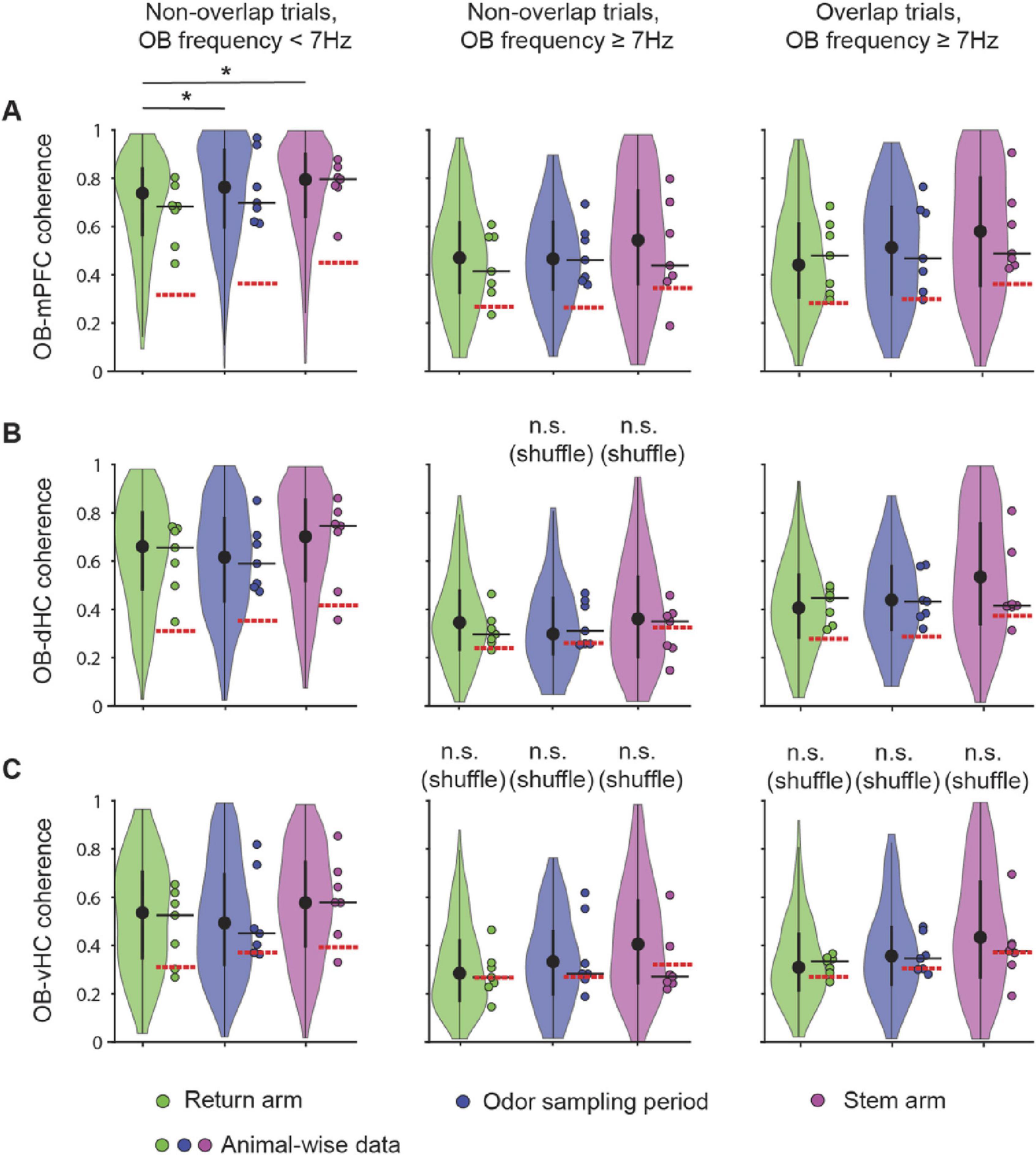 Figure 5. Coupling of cortical areas with OB oscillations occurred in all task phases and at high and low RRO frequencies. Violin plots of OB-mPFC (A), OB-dHC (B), and OB-vHC (C) coherence in the return arm, the odor sampling period, and the stem arm. Non-overlap trials with RRO frequency < 7 Hz, non-overlap trials with RRO frequency ≥ 7 Hz and overlap trials with RRO frequency ≥ 7 Hz were analyzed separately. Coherence in each trial was calculated at the RRO frequency. Significant differences between task phases were found only for OB-mPFC coherence with OB frequency < 7 Hz [n = 7 mice, OB-mPFC: (1) = 7.18, p = 0.028; OB-dHC: (1) = 2.33, p = 0.31; OB-vHC: (1) = 2.58, p = 0.27, Friedman Test]. Post hoc Wilcoxon Rank Sum tests with a Bonferroni-Holm correction was performed to determine that coherence was higher in odor sampling and stem compared to return. In addition, coherence was higher with RROs at low (<7 Hz) compared to high frequencies (≥7 Hz), for mPFC and vHC irrespective of overlap, but for dHC, depending on overlap (see text and Supplementary Table 3 for details). Violin plots: center circle, median; bottom and top of thick vertical line, 25th and 75th percentile, horizontal width, relative frequency. Dots with a black outline, data from individual mice; thick black horizontal line; median of animal-wise data; red dashed horizontal line, chance level of coherence obtained from shuffling pairs of LFP signals across trials. *p < 0.05.