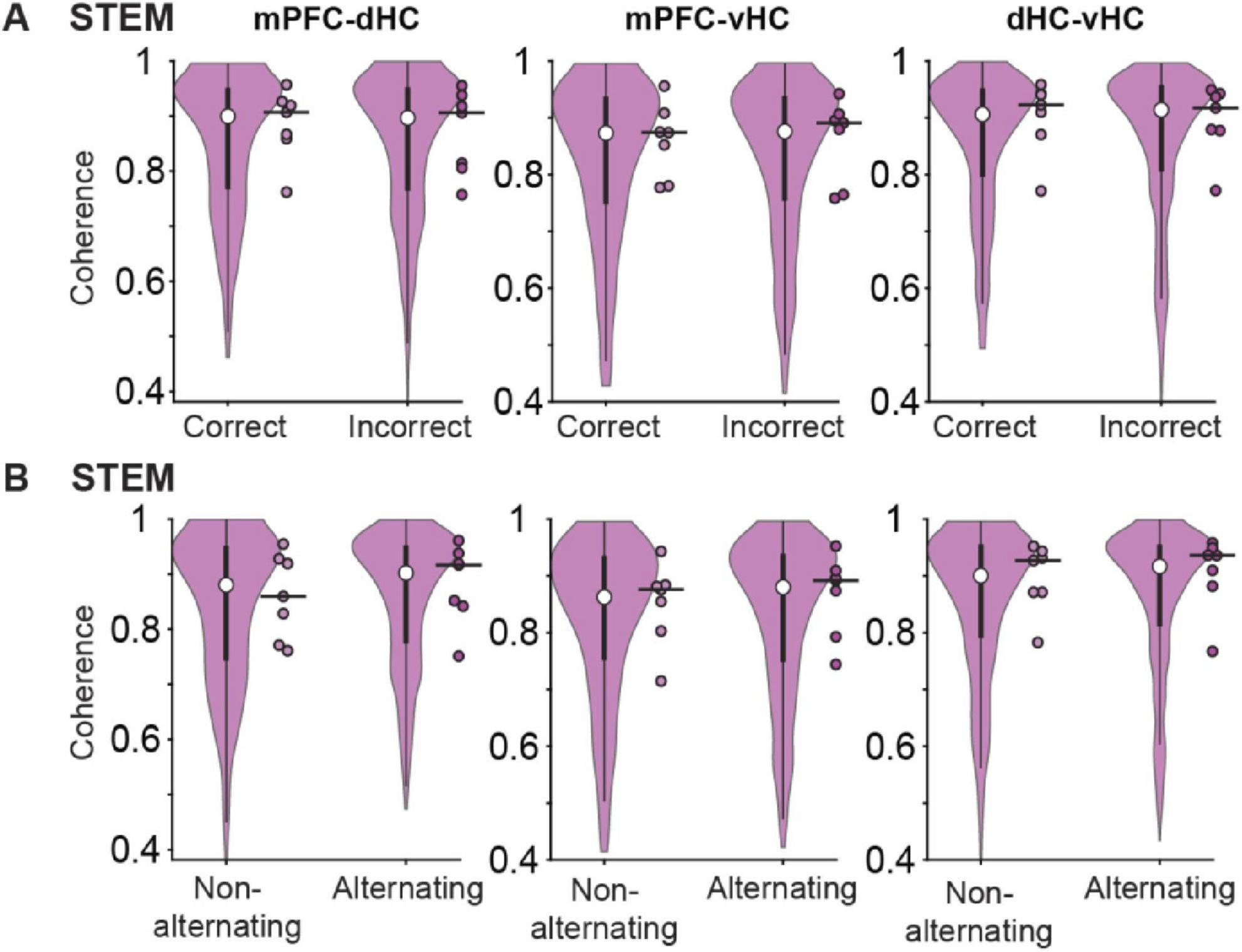 Figure 7. Movement-related theta oscillations in the stem arm were highly coherent across cortical regions during correct and incorrect choices and during alternating and non-alternating choices. (A) Coherence of movement-related theta oscillations between pairs of regions in the mPFC-dHC-vHC network in the stem arm is compared between trials with correct and incorrect choices. Coherence was not different between trials with correct and incorrect choices (see text for statistics). (B) Same as panel (A), but for alternating compared to non-alternating choices. Coherence was not different between trials with alternating choices compared to trials with non-alternating choices (see text for statistics). Violin plots: center circle, median; bottom and top of thick vertical line, 25th and 75th percentile, horizontal width, relative frequency. Dots with a black outline, average data from individual mice; thick black horizontal line; median of animal-wise data.