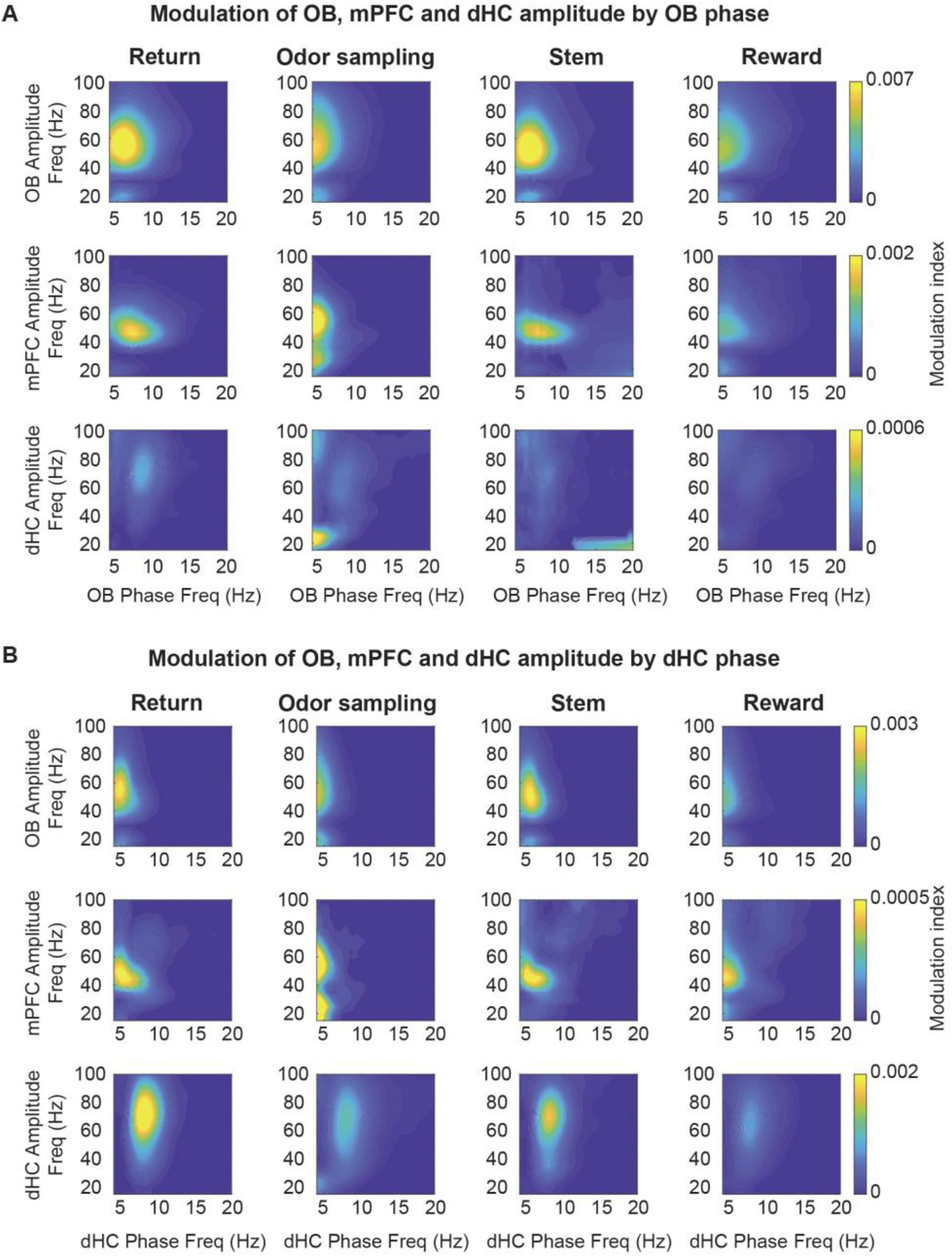 Figure 8. The amplitude of gamma and beta oscillations in OB, mPFC and dHC was modulated by the phase of OB and theta oscillations. Coupling of OB, mPFC and dHC oscillation amplitude (20–100 Hz) to the phase of OB oscillations (A) and theta oscillations (B). Beta oscillations in the OB were modulated by OB phase in all task phases. Beta oscillations in the mPFC and dHC were modulated by the phase of OB and canonical theta oscillations, but predominantly during odor sampling. Low gamma (30–60 Hz) amplitude in OB and mPFC was modulated by OB and canonical theta phase in all task phases. Mid gamma (60–100 Hz) amplitude in dHC was predominantly modulated by canonical theta phase, and this modulation was more pronounced during movement on the return and stem arms. Color scale, modulation index.