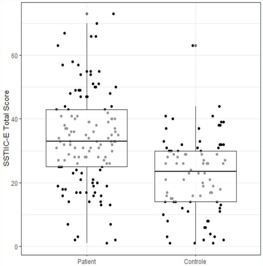 The SSTIC-E score was much higher on average in patients (34.06, SD = 15.19) than in controls (22.55, SD = 12.04), (95% CI: −13.51, −7.87), (see Figure 1), and the difference is statistically significant (t_202 = 6.17, p < 0.001).