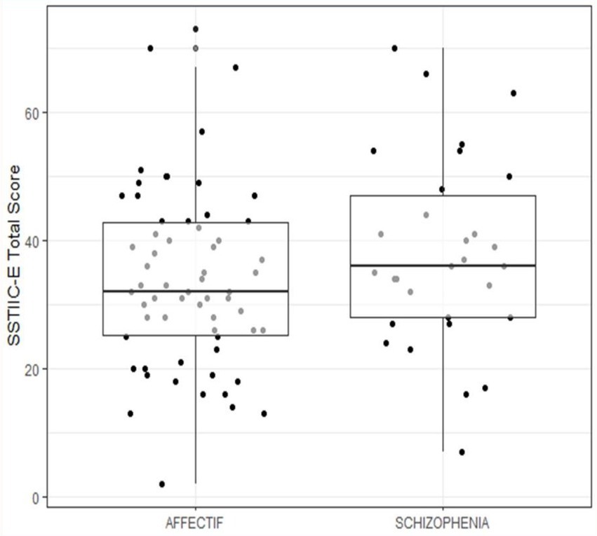 The SSTIC-E score is slightly higher in patients suffering from schizophrenia (m = 38.0) as opposed to patients suffering from affective disorders (BAD, MDD) (m = 34.0); however, the difference is not statistically significant (t55 = −1.24, p = 0.22) (see Figure 2).