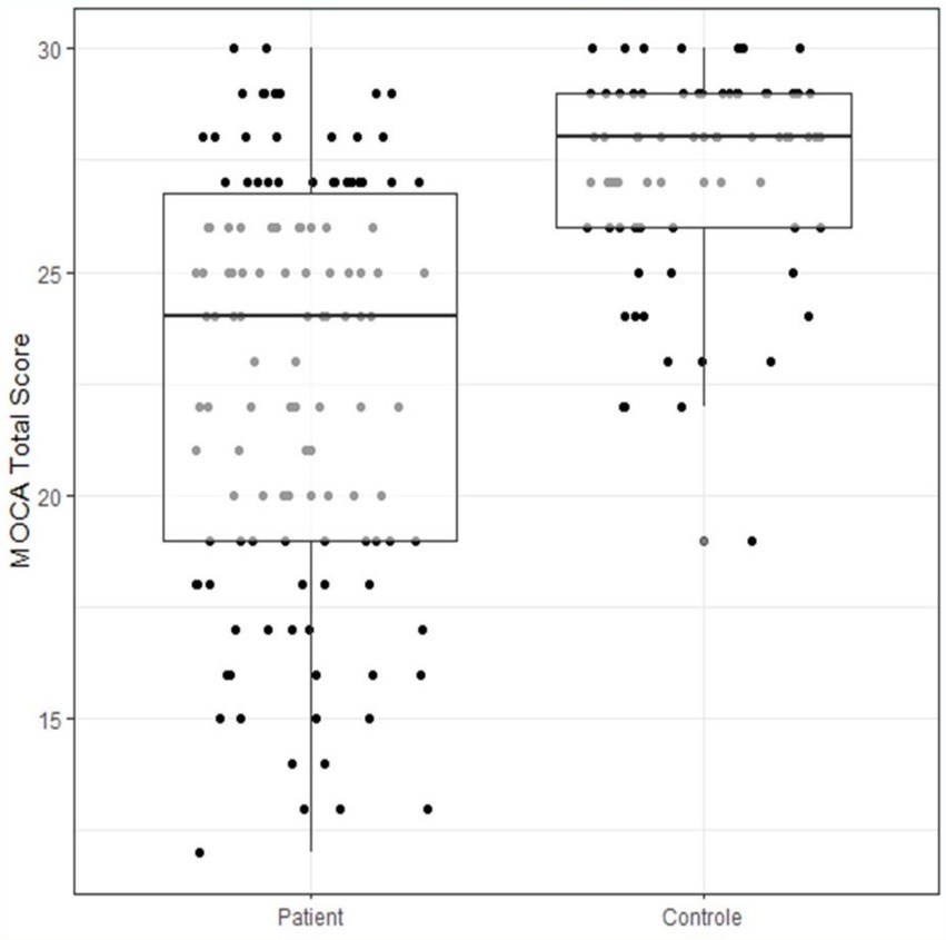 The MOCA score (Figure 2) is much lower on average in patients (22.71, SD = 4.58) than in controls (27.19, SD = 2.24), (95% CI: 3.08, 5.87), (see Figure 3), and the difference is statistically significant (t_193 = −9.41, p < 0.001).