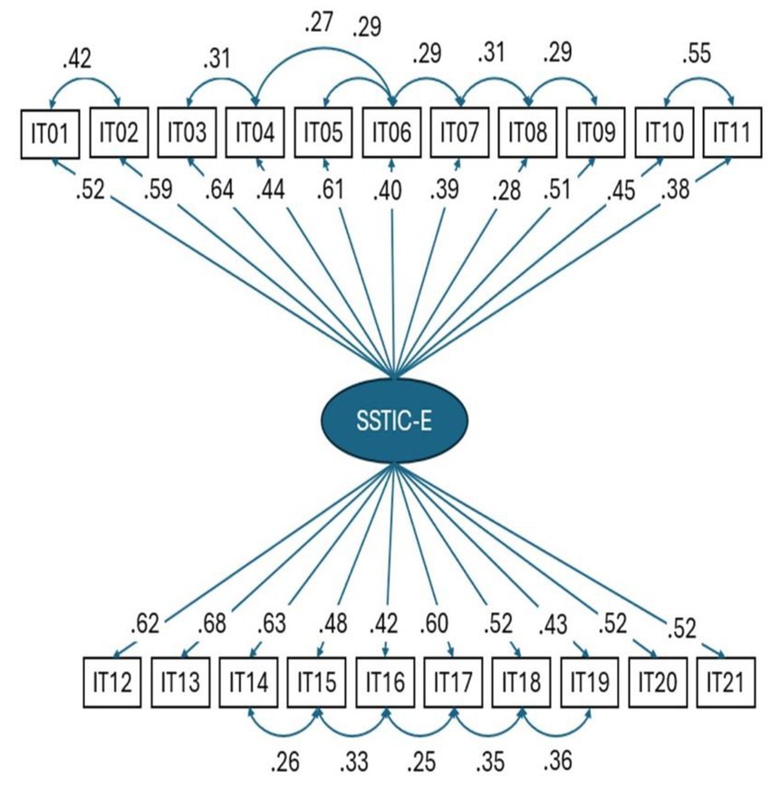Similarly, our study validated the Arabic version of the SSTIC-E, achieving high internal consistency with a Cronbach’s alpha coefficient of 0.89 (95% CI: 0.86–0.91). However, the confirmatory factor analysis indicated that while the 1-factor model did not fit well, a revised model with additional item correlations (e.g., memory and task organization) improved fit indices (CFI = 0.91, RMSEA = 0.058, SRMR = 0.072). This suggests that, like previous studies, SSTICS is a reliable tool, but there might be a need to account for item-specific correlations.